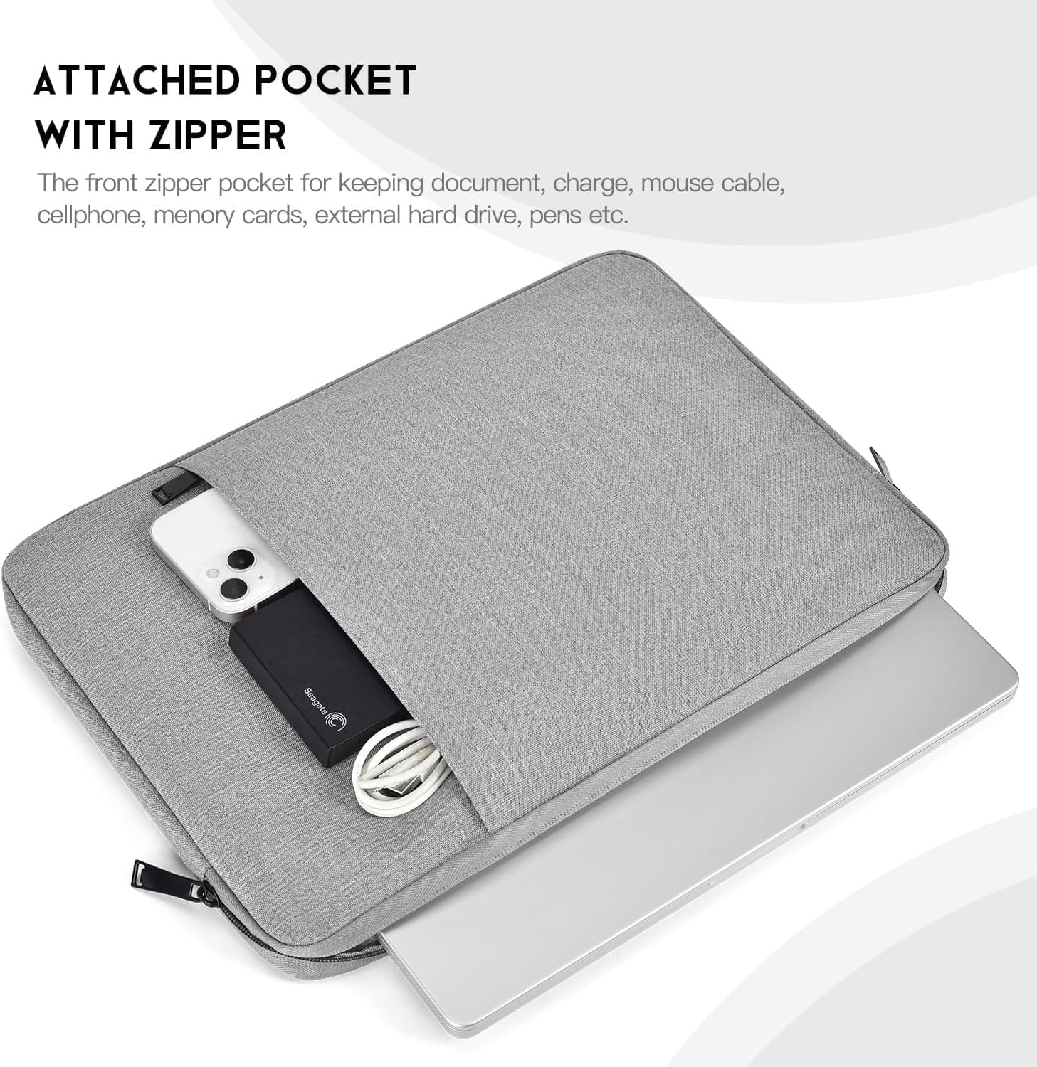 The main inner compartment holds your laptop.The extra front pocket storage space can keep your pens, cables, mouse, earphone, mobile phones, iPad or other laptop accessories well-organized.The double opening zipper slides smoothly, making it convenient and safe to use your device.
