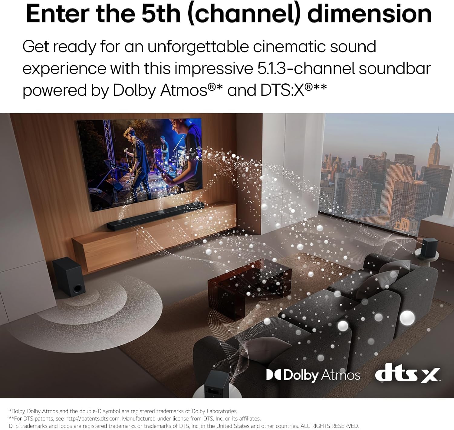 LG S80TR 5.1.3 ch. Dolby Atmos Soundbar with Wireless Subwoofer and Rear Speaker Included, TV Synergy, Wow Orchestra, Wow Interface, WOWCAST Built-in, 2024 New Model