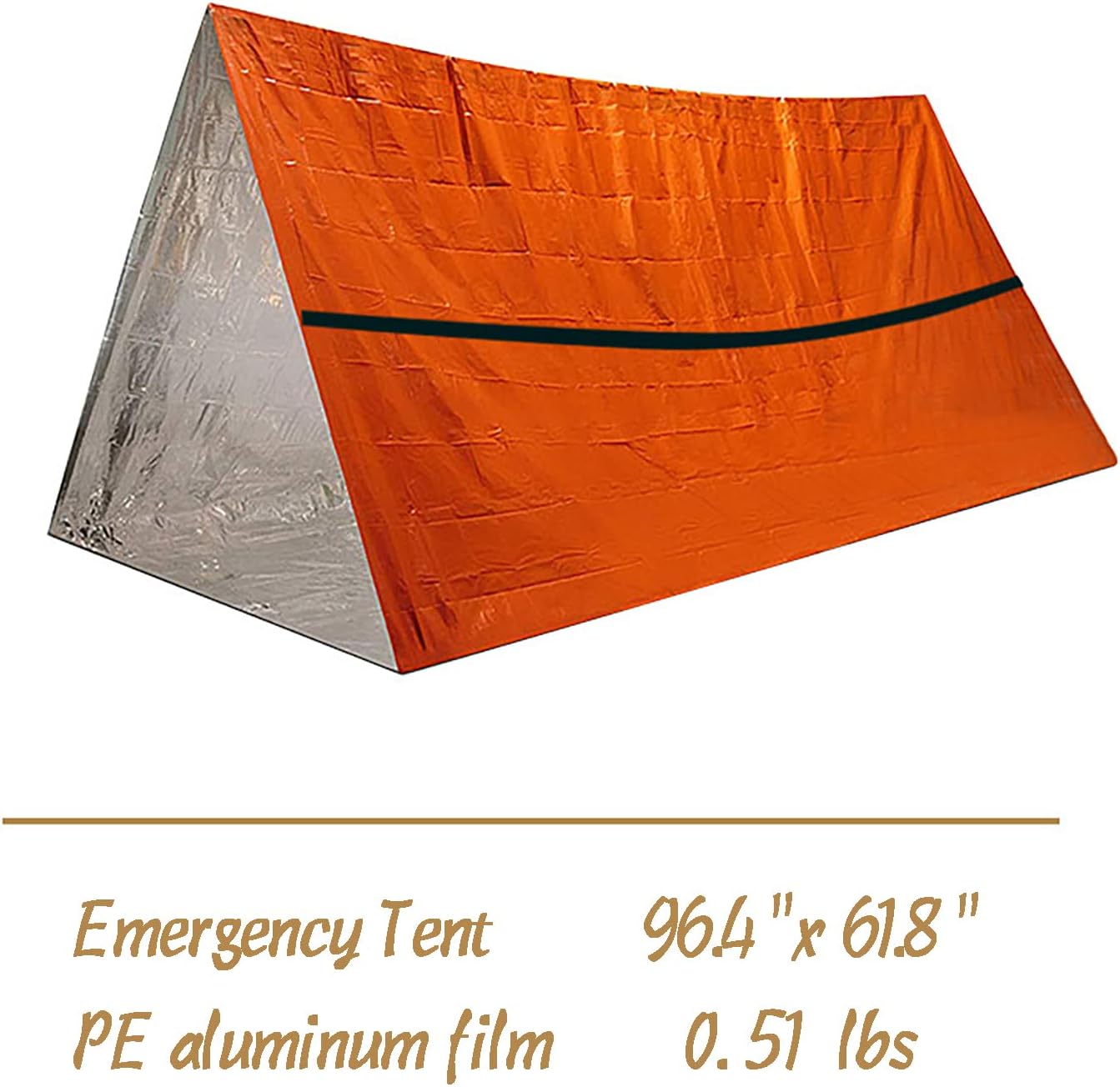 Emergency tent: unfolding size -94.5inchx57inch, folding size -7.2inchx11.2inch, weight – 6oz / 170g. Material: aluminum film + PE film + color film. Attached nylon rope.