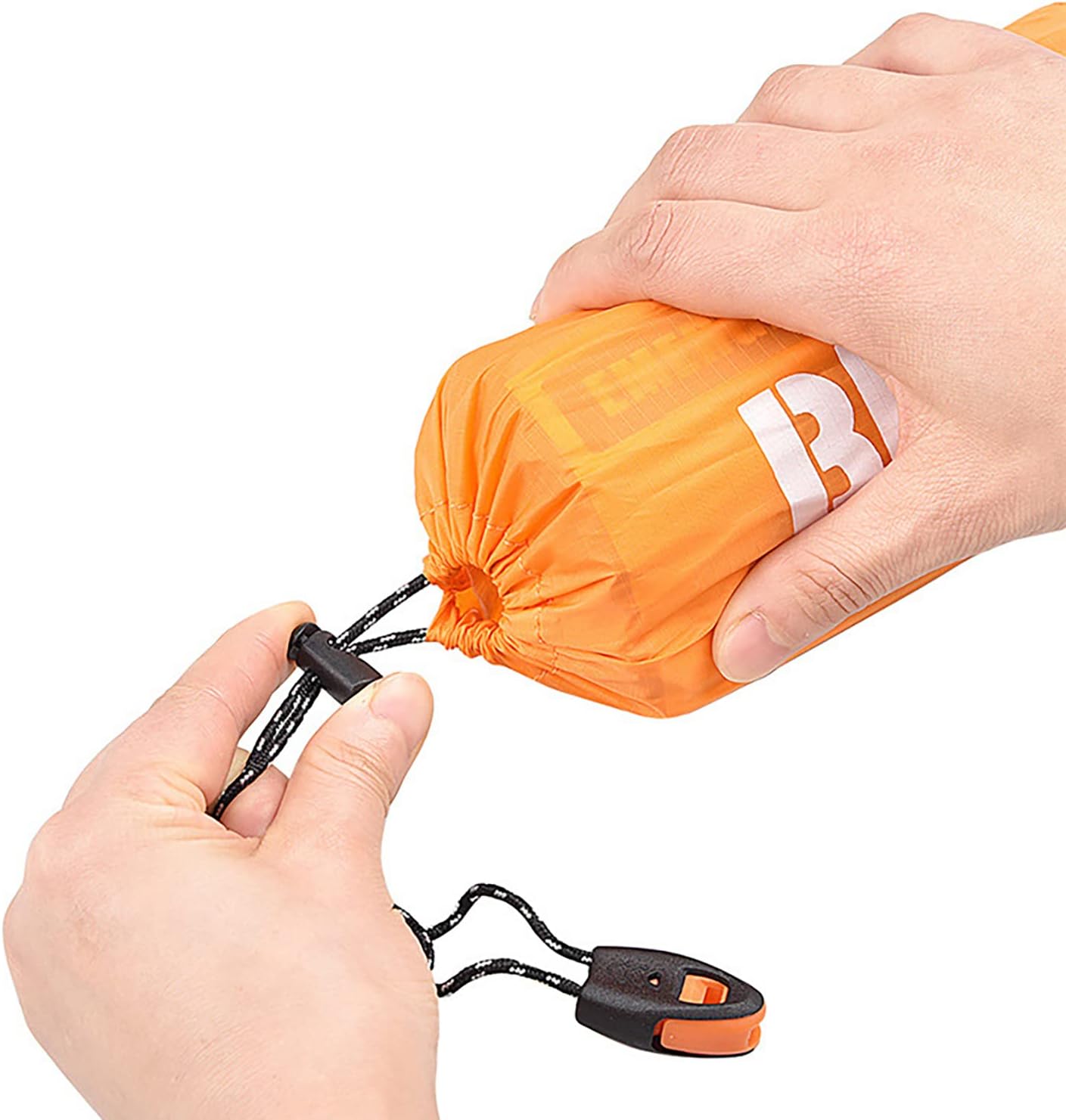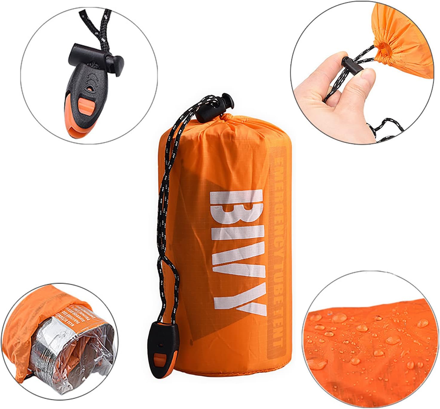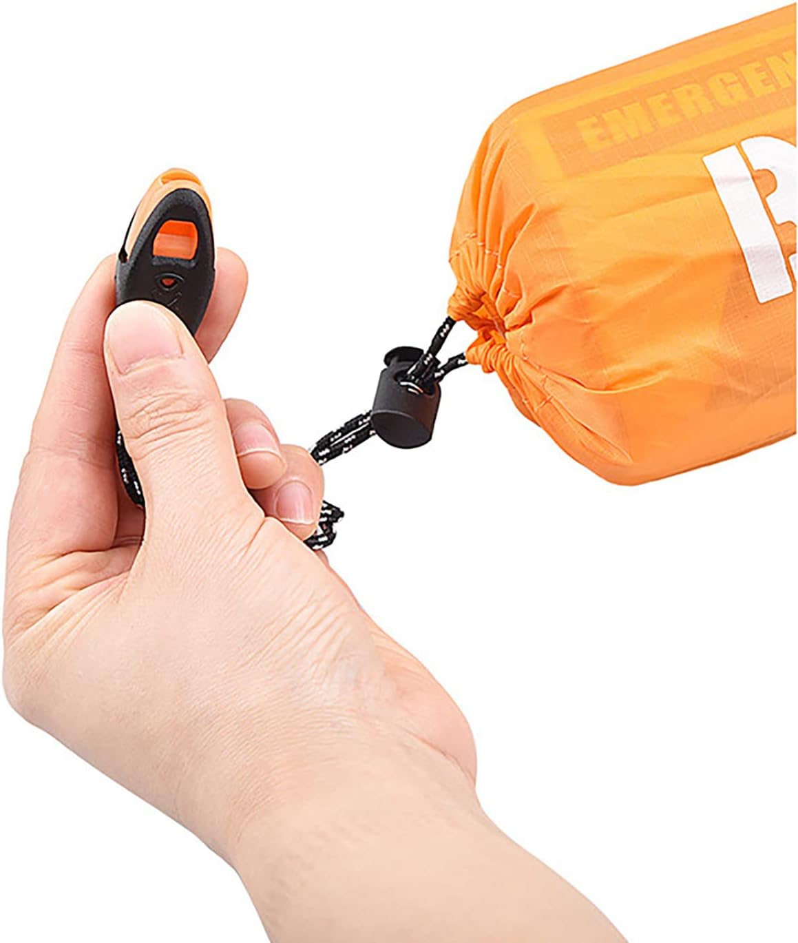 Emergency sleeping bag: unfolding size -84.6inchx35.4inch, folding size -2.7inchx4.7inch, weight -4.8oz/137g. Material: aluminum film + PE film + color film. Nylon drawcord storage bag with survival whistle.