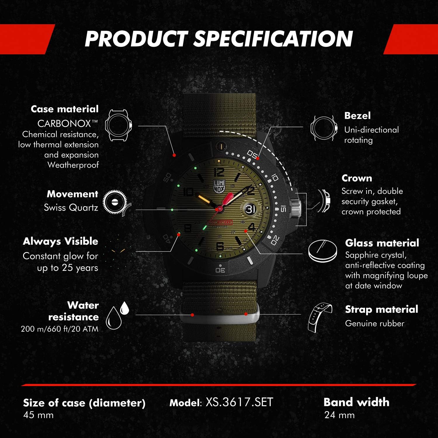 Luminox – Mens Watch Navy Seal Magnifying Glass XS.3617.Set: 45mm Green Black Dial Webbing Green Strap Water Resistance: 200 Meters – Mens Watches – Made in Switzerland