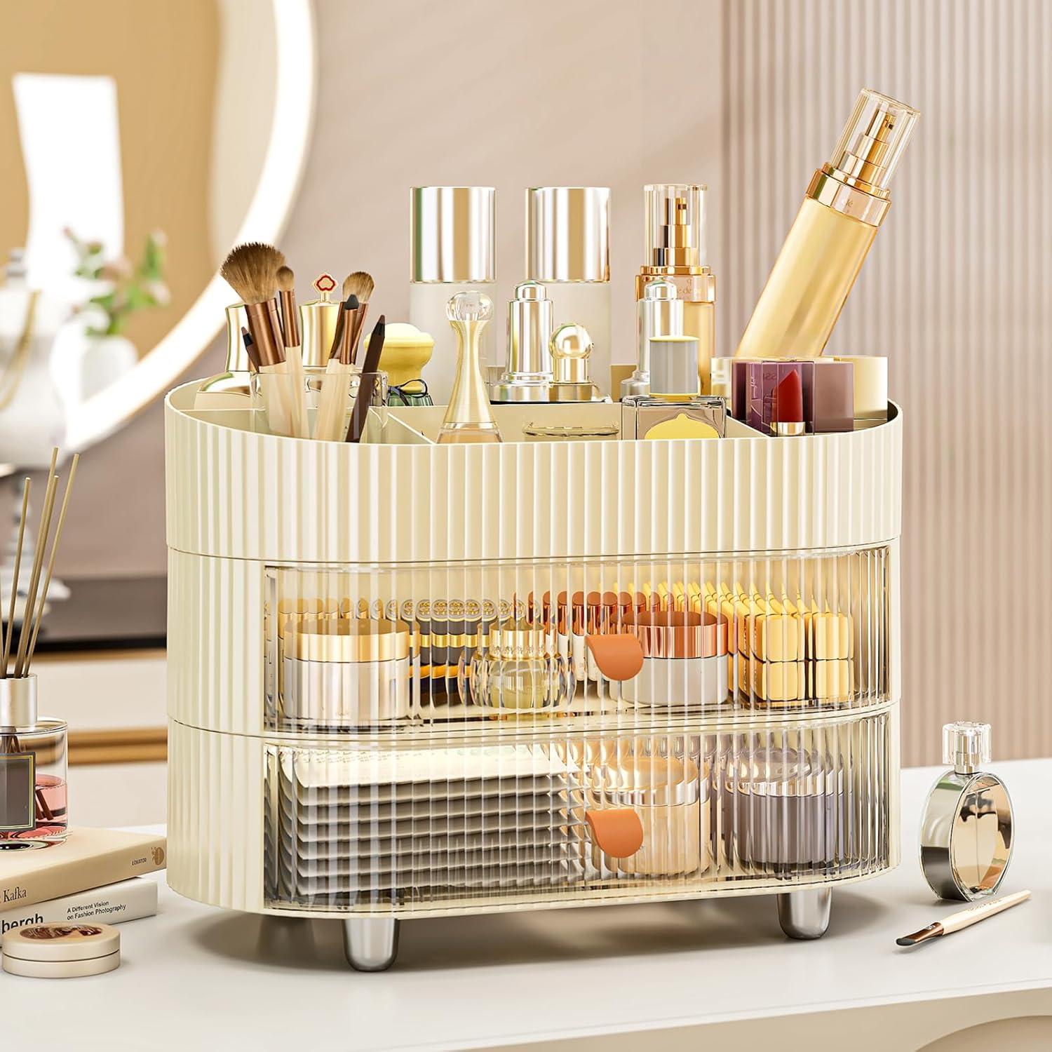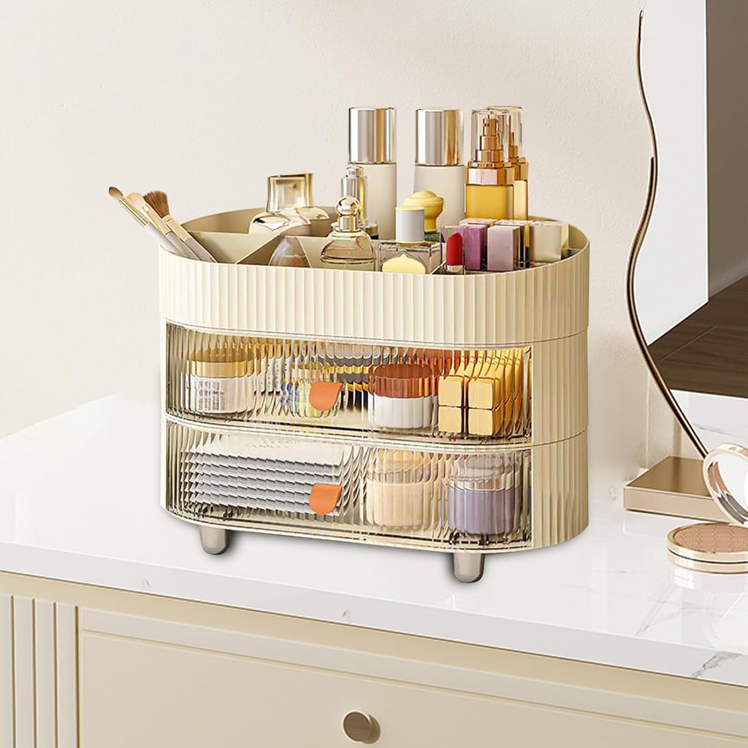【Increase Capacity】 This makeup organizer includes a multi-compartment top storage and two drawers, which can accommodate cosmetics and skincare products of different sizes in different categories, meet daily needs. The open space at the top of the cosmetic organizer can store high bottles of cosmetics at will, the drawer of the skincare organizers can store masks, ornaments and other items.The skin care organizer can classified and stored, so that the required cosmetics can be quickly found.