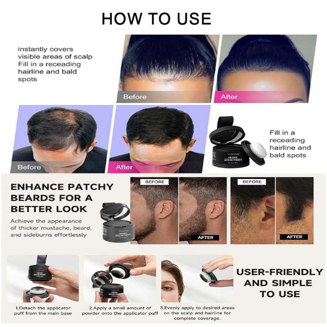 【Easy to Use】Simply open the sponge applicator, dip the right amount of root touch-up powder, and gently apply to the bald spot, gray roots, receding hairline, or thinning areas. For best results, pat the powder from the edge of the hairline from light to dark and tap with your fingers