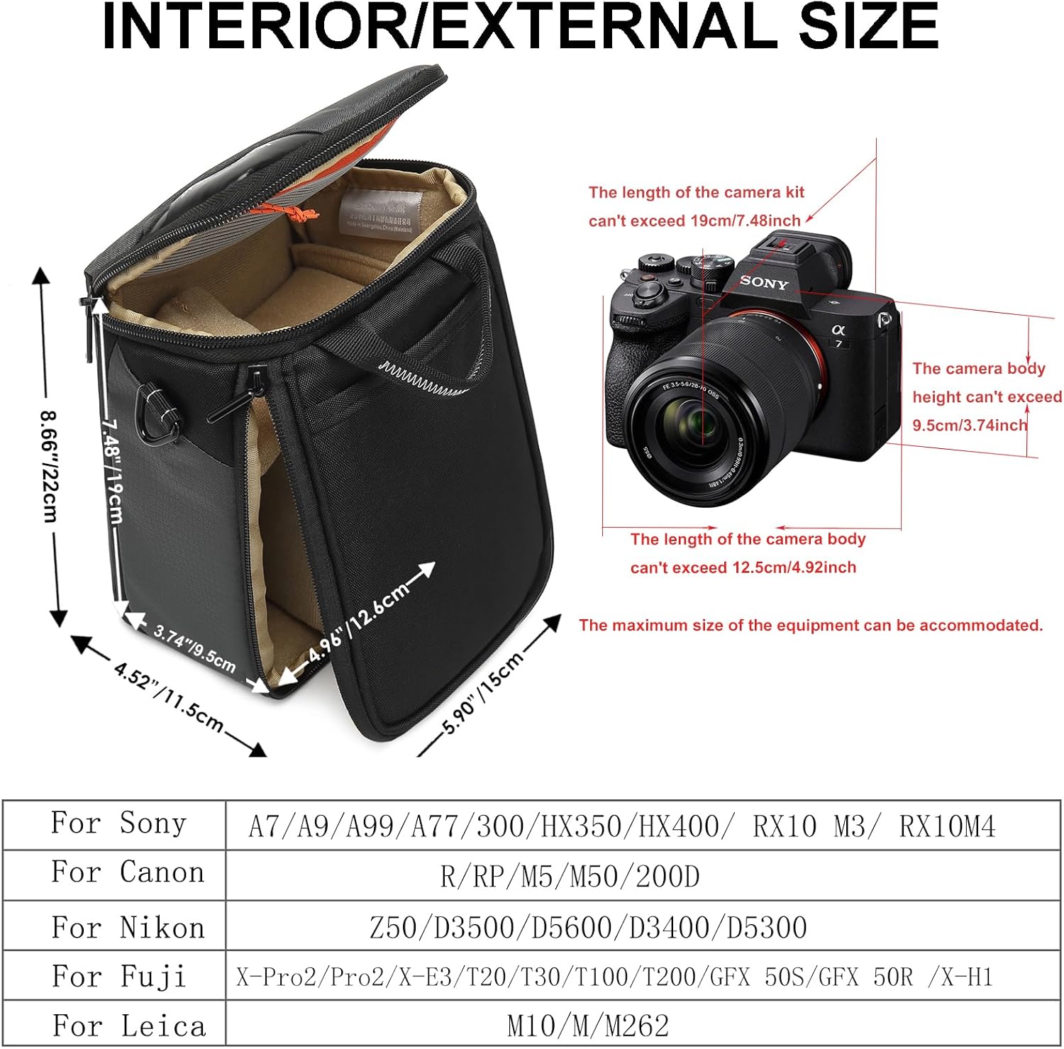 Compact Size:Interior Size: 4.96×7.48 x3.58 inches;Exterior Size: 5.9 x 8.46 x 3.93 inches;Weighs only 0.29 lbs. The camera shoulder bag is compact and lightweight, making it easy to carry and use, which is very suitable for daily use and travel.If height of the camer body is more than 7.5cm (2.95inch)and less than 9.5cm(3.74inch),please choose M size