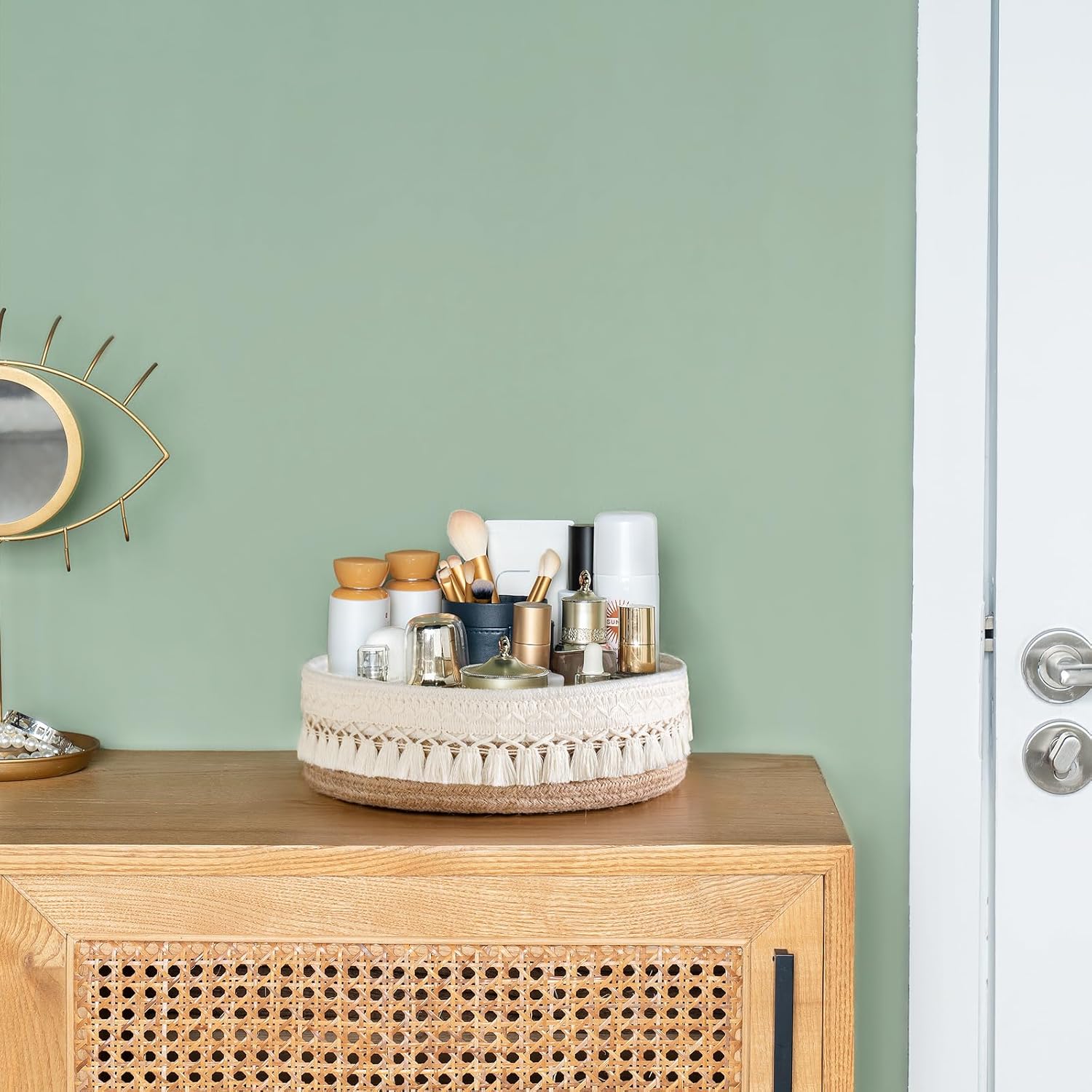 Stylish and Practical: Our macrame makeup storage basket with tassels would be the perfect addition to any vanity. It made of decorative jute and cotton arope, add a bohemian element, great for anywhere in your home.