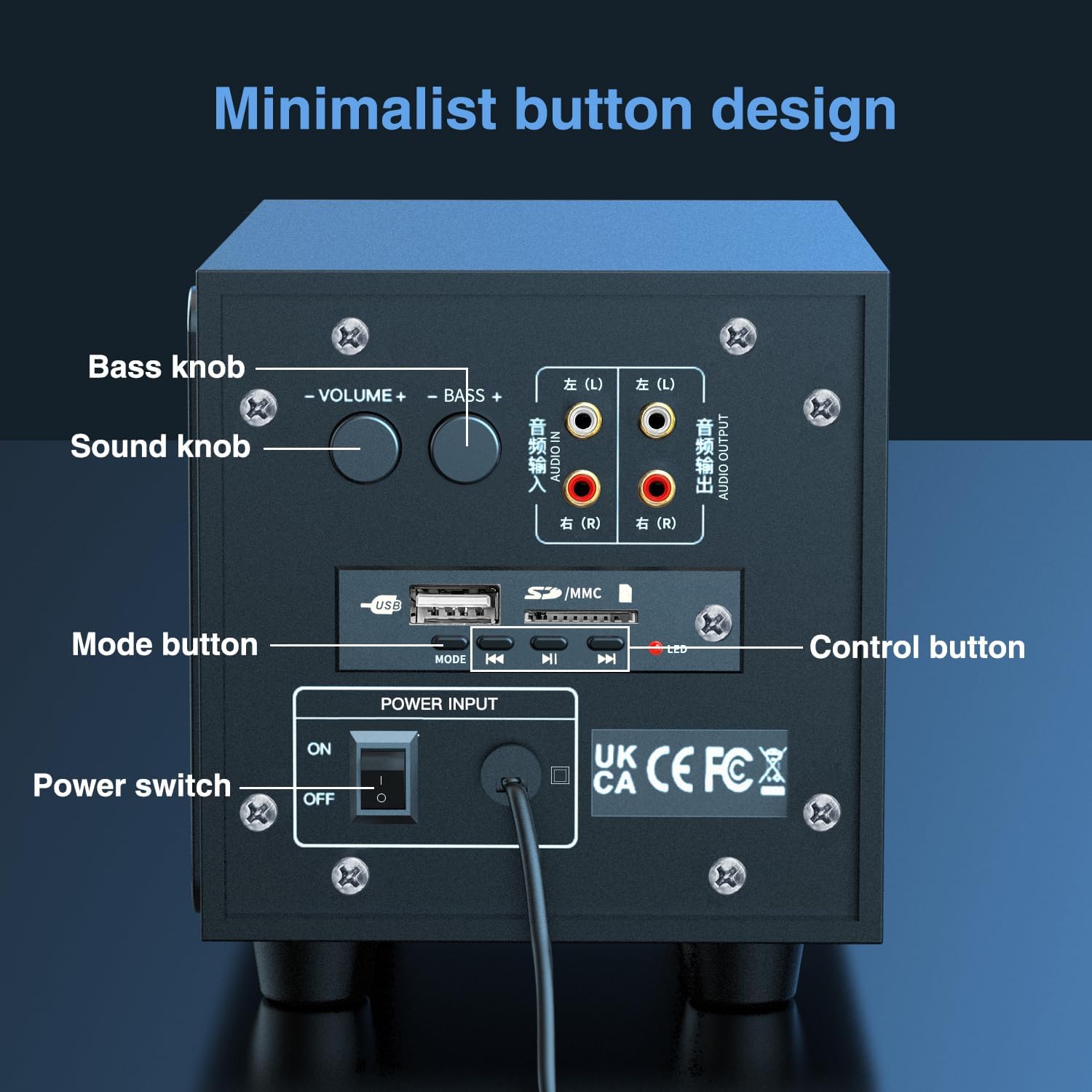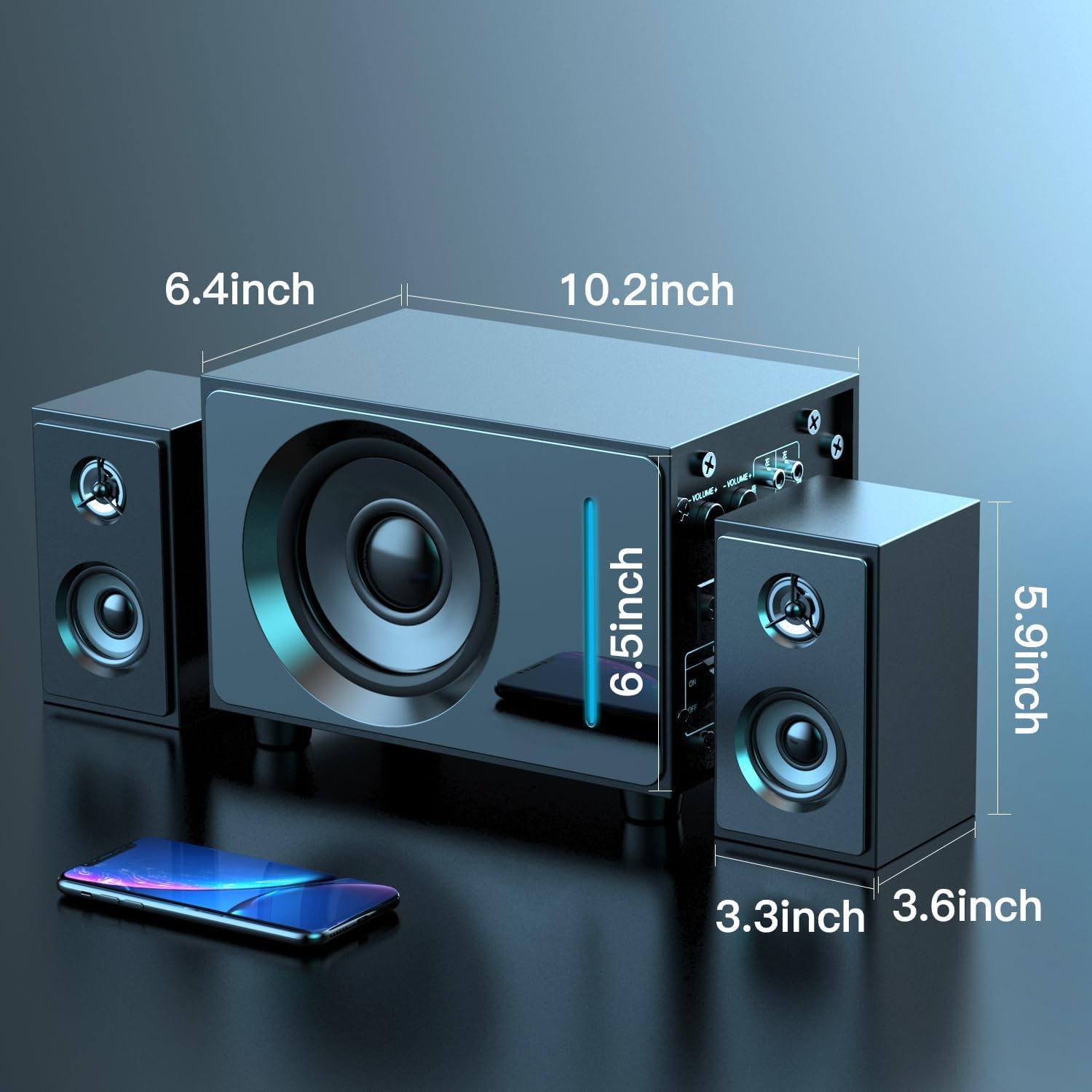 【Powerful stereo sound】 2.1 Computer Speakers System with 5.5” subwoofer and dual 2.5” mid-treble full-range satellites, Forms a surround sound system and combined with the wood enclosure that effectively reduces sound resonance, it produces a stable and thick sub-bass, as well as clear highs.