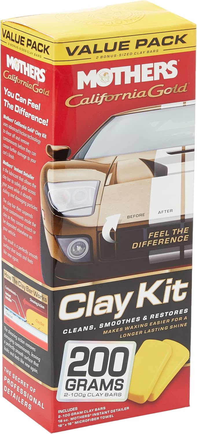 COMPLETE CLAY KIT – With 3 Clay Bars, (1) 16 oz. Mothers California Gold Instant Detailer, and (1) 16″ x 16″ Microfiber Towel, this kit is trusted by professionals to remove debris, clear scratches, and prepare your car for its final waxing.
