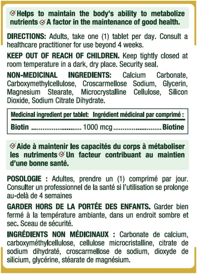 Nature’s Bounty Energy Health Biotin Coated Tablets, 1000 mcg, 100 Ct (1 Pack)