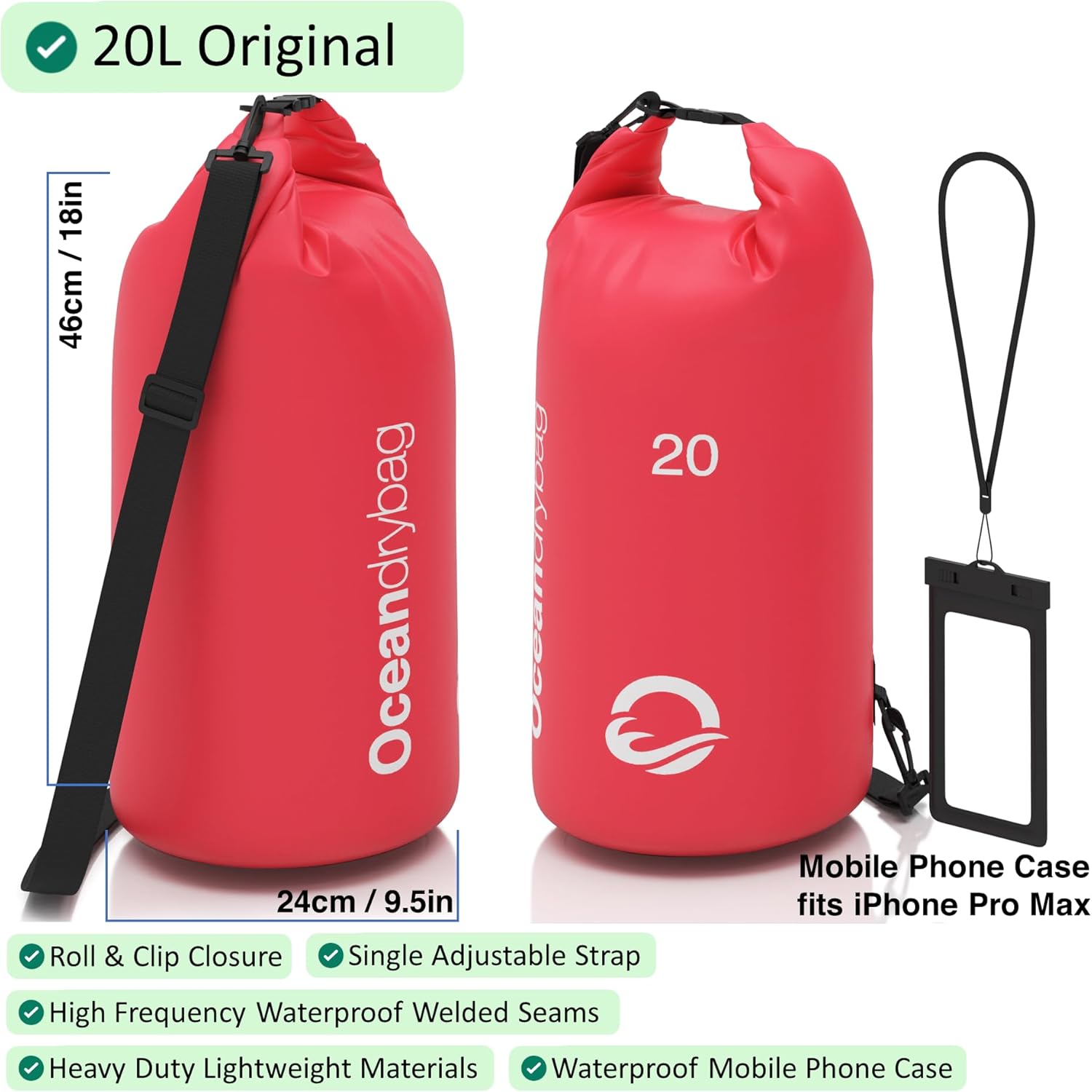 20L Original Size and Features: 1 x Waterproof Bag with an Integral Roll Top Easy-Close System, 1 x Adjustable Single Strap, 1 x Waterproof IPX8 certified Mobile Dry Case with a Snap and Lock Seal System, Dual-sided Clear Windows and Neck Strap.