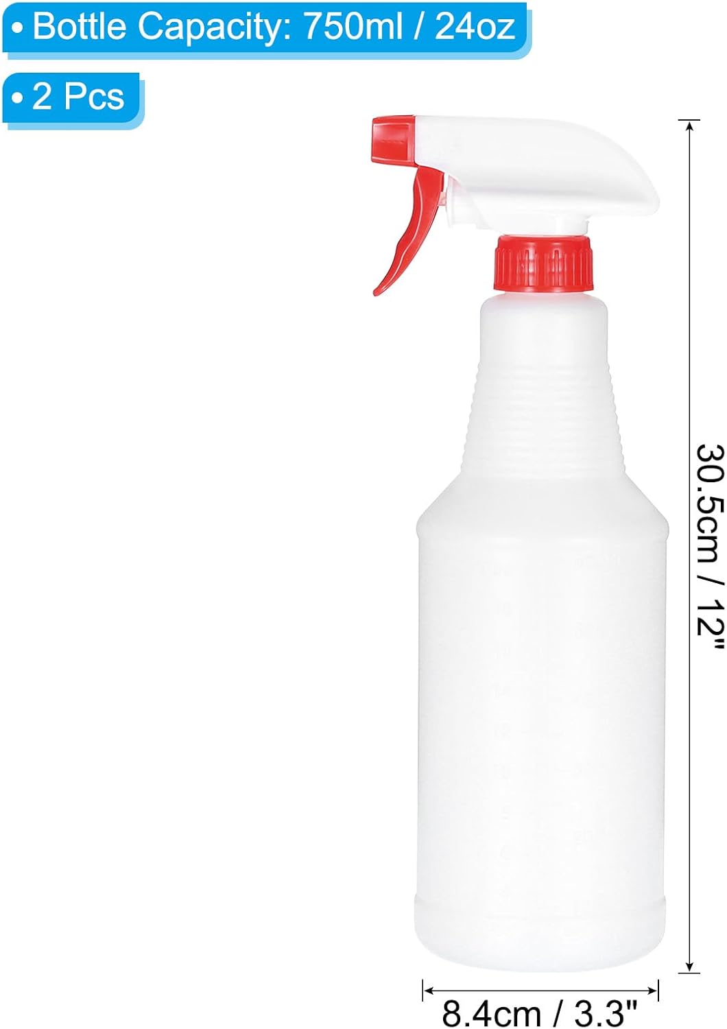 Color: Red, White; Material: Plastic; Bottle Capacity:750ml/24oz; Total Dia.: 8.4cm / 3.3 inch; Total Height: 30.5cm / 12 inch; Bottle Neck Size: 27mm / 1.06 inch; Packing List: 2 x Spray Bottles