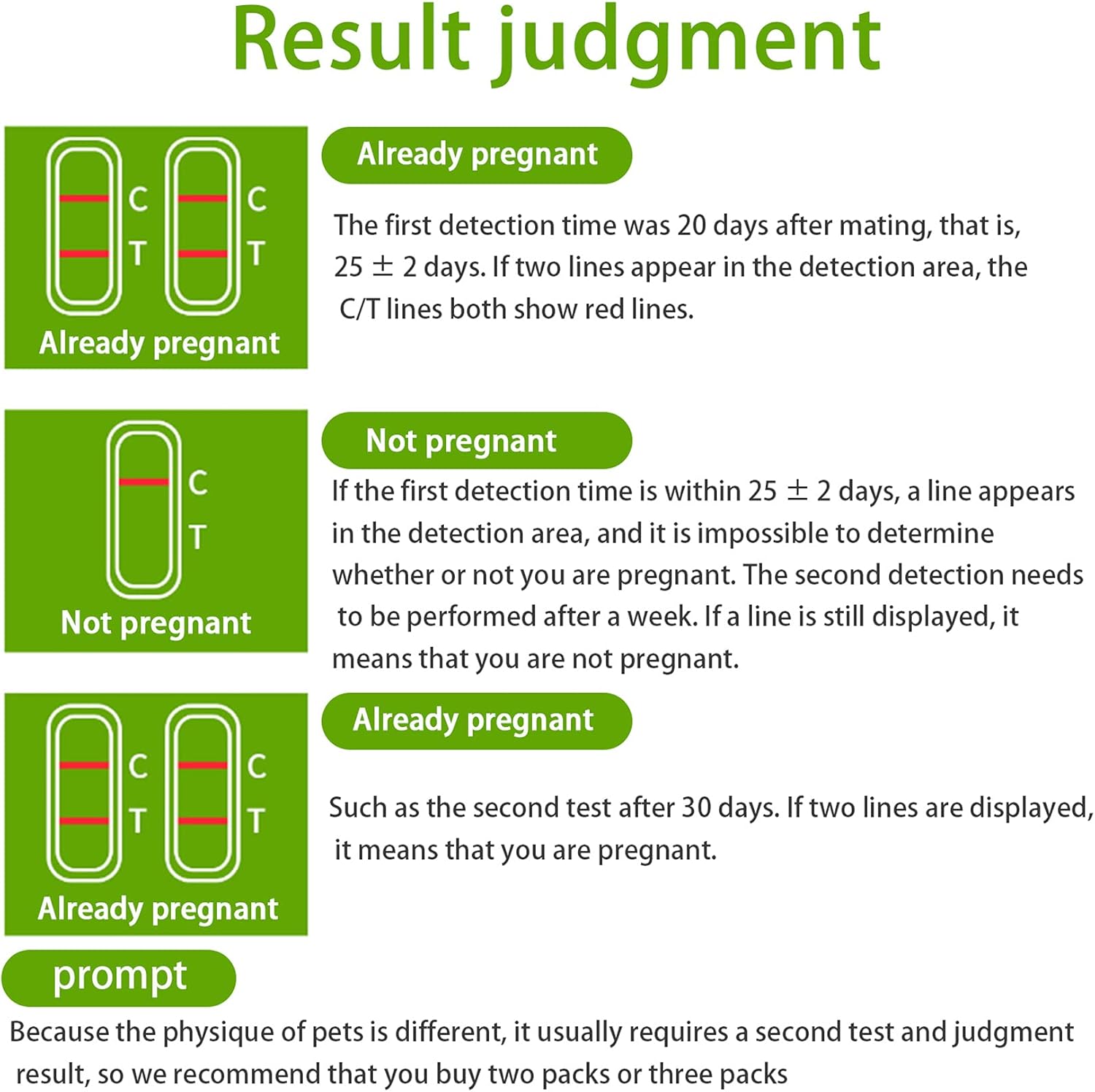 Purchase notice: Since each dog has a different physique, it is necessary to pass a second test to determine whether it is really pregnant. We recommend that you buy 2 packs or 3 packs. If you have any questions during the purchase process, please send an email to ask in time, we will continue to serve you online