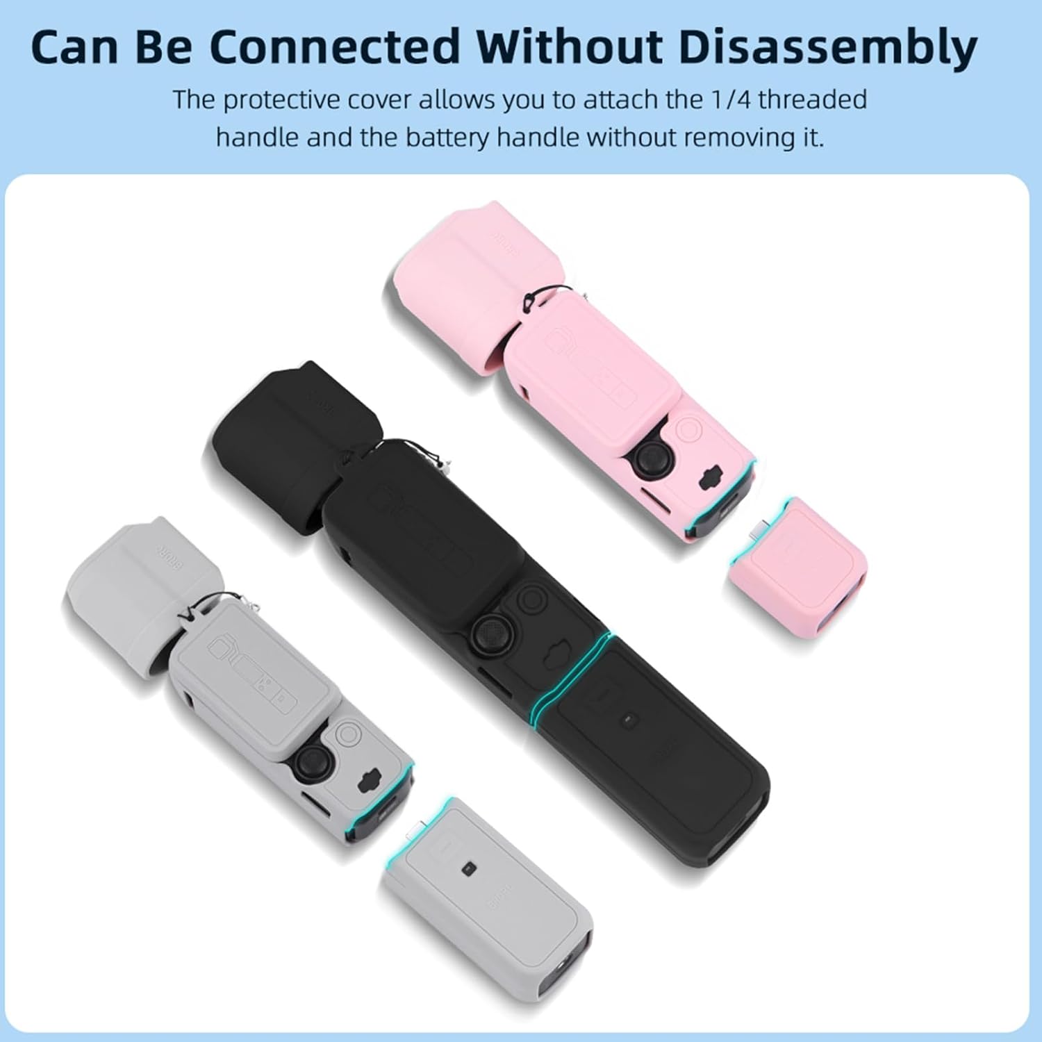 EASY TO INSTALL – Turn off Pocket 3 first and insert camera lens into to the silicone cover. Then install the silicone case of the body. Tie the anti loss rope onto the silicone cover and screen protector on the body. Finally, insert the silicone case into the 1/4 thread handle and battery handle.
