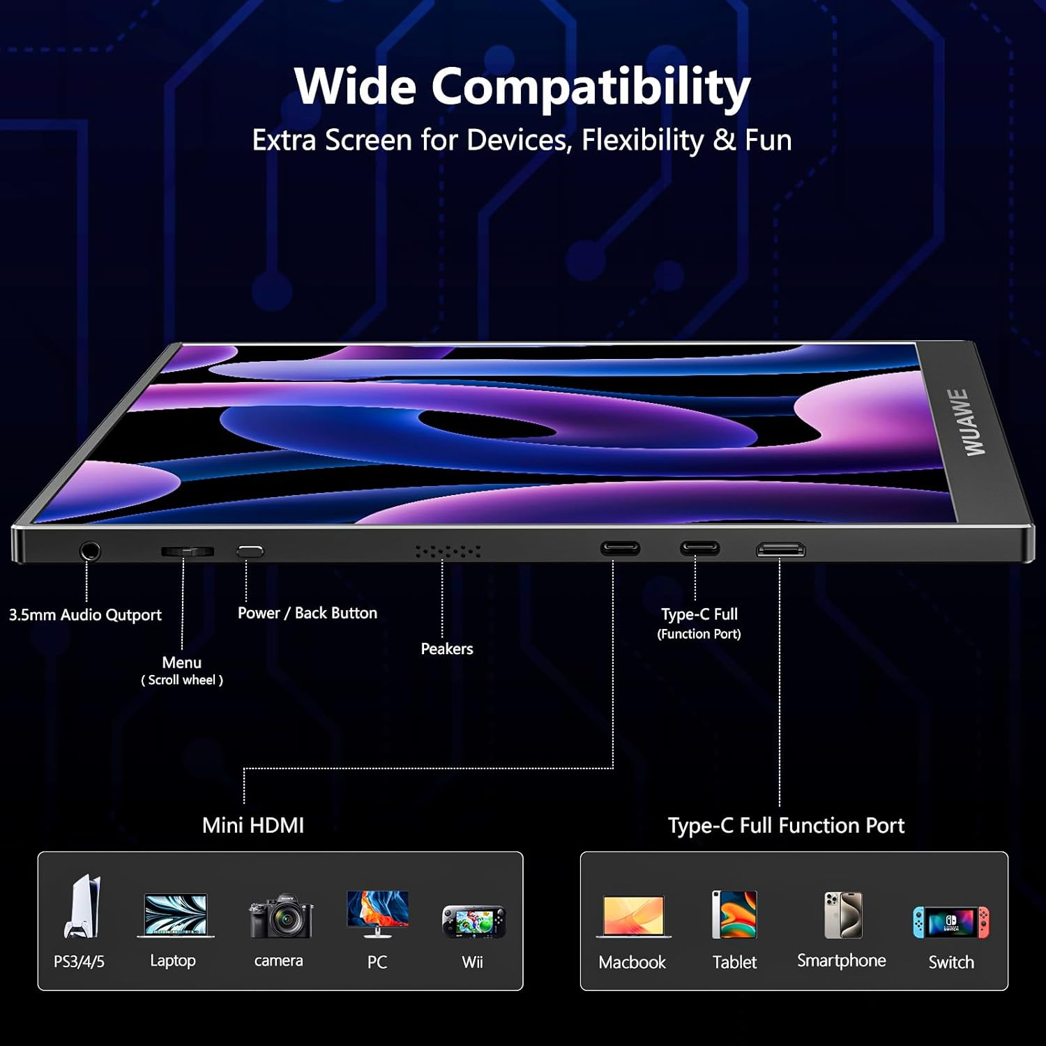 Plug and Play Portable Monitor: Simply connect to power and display signal transmission using a USB Type-C cable – no drivers needed. Portable monitor for laptop equipped with 2 USB Type-C ports and Mini-HDMI port, easily connect to your laptop, PC, cell phone, Mac, PS5/PS4, Xbox, Switch for seamless connectivity on-the-go(Note: Thunderbolt 3.0 or USB 3.1 Type C DP ALT-MODE required for compatibility)