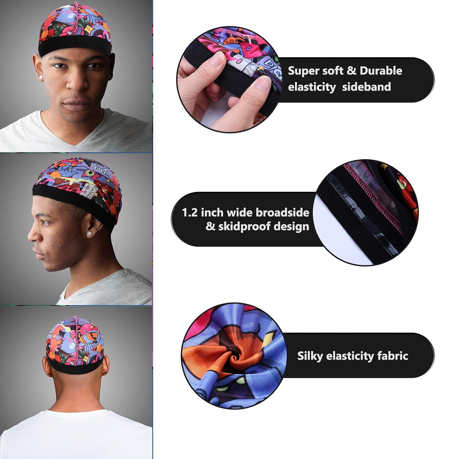 🔥HIP-HOP DESIGNER DURAG & WAVE CAP WITH SATIN ELASTICITY MATERIAL,OUTSIDE MIDDLE STITCHING & ANTIKID DESIGN,KEEPING PRESS TO LAY DOWN THE HAIR WITH MAXIMUM COMFORT.The designer durag with 47 ” LONGER & 3” WHIDER STRAP FOR EASY TIE. The wave cap silky with anti-falling design, it uses 1.2” wider & built in antislip side band. Thanks to the super soft and skin-friendly materiel,95% Polyester+ 5% Spandex,it will gives suitable pressure to lay down the hair with maximum compfort.