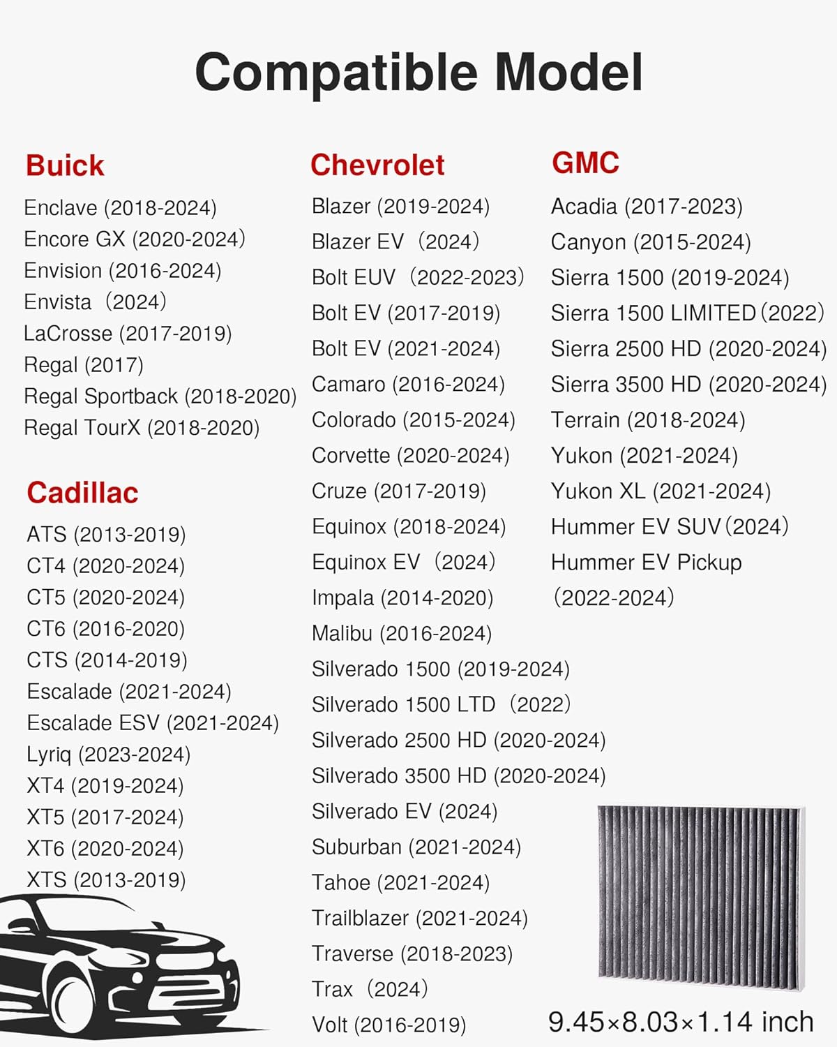 Compatible Auto List: Buick: Enclave (2018-2024), Encore GX (2020-2024), Envision (2016-2024), Envista(2024), LaCrosse (2017-2019), Regal (2017), Regal Sportback (2018-2020), Regal TourX (2018-2020). Cadillac: ATS (2013-2019), CT4 (2020-2024), CT5 (2020-2024), CT6 (2016-2020), CTS (2014-2019), Escalade (2021-2024), Escalade ESV (2021-2024), Lyriq (2023-2024), XT4 (2019-2024), XT5 (2017-2024), XT6 (2020-2024), XTS (2013-2019).