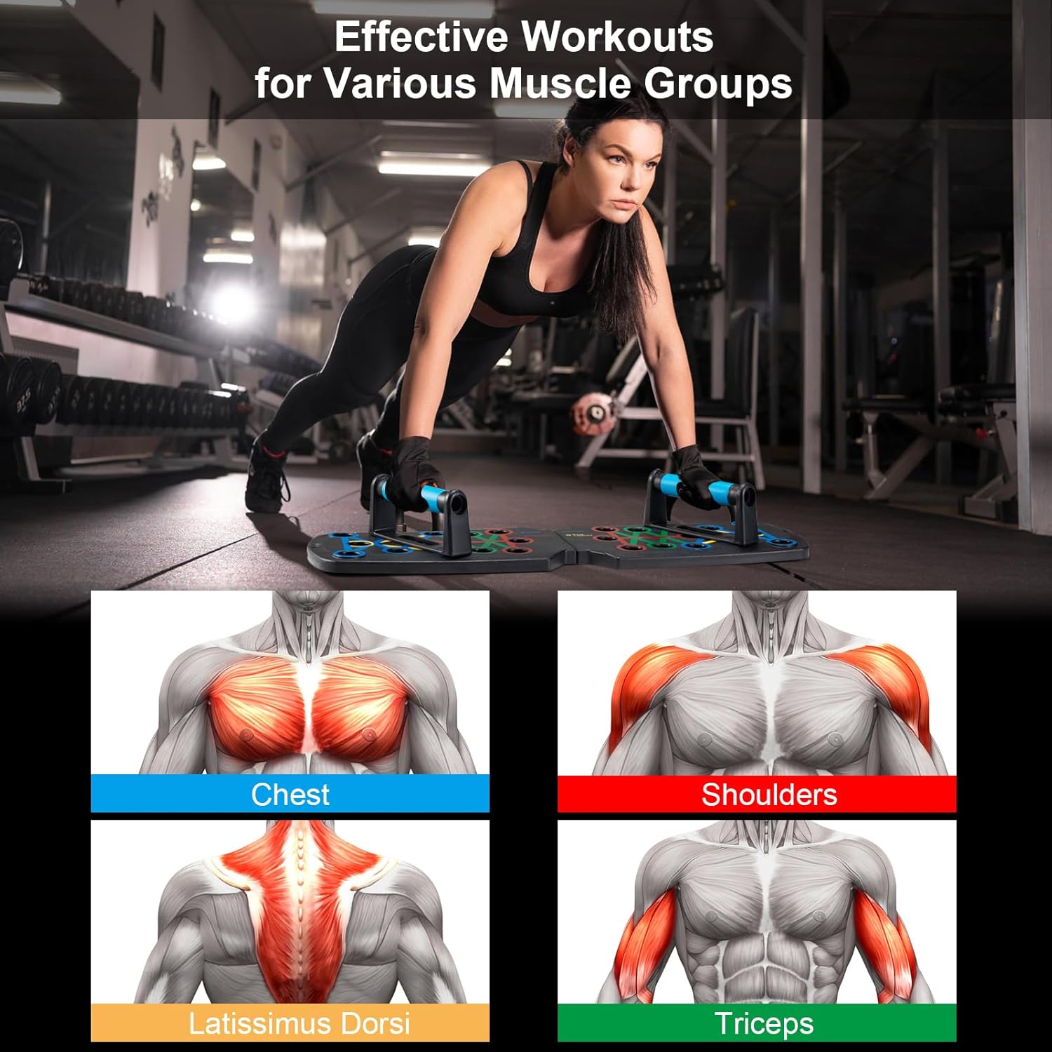 Ultimate Versatility: Designed for targeting various muscle groups, the push up board is divided into four color-coded zones representing different muscle groups including the latissimus dorsi, triceps, chest, and shoulders. By inserting the pushup anti-slip handles into specific positions on the board according to the targeted muscle group, you can engage core muscles for optimal workout results. With 28 different exercise methods, this pushup bra keeps your workouts challenging and effective.
