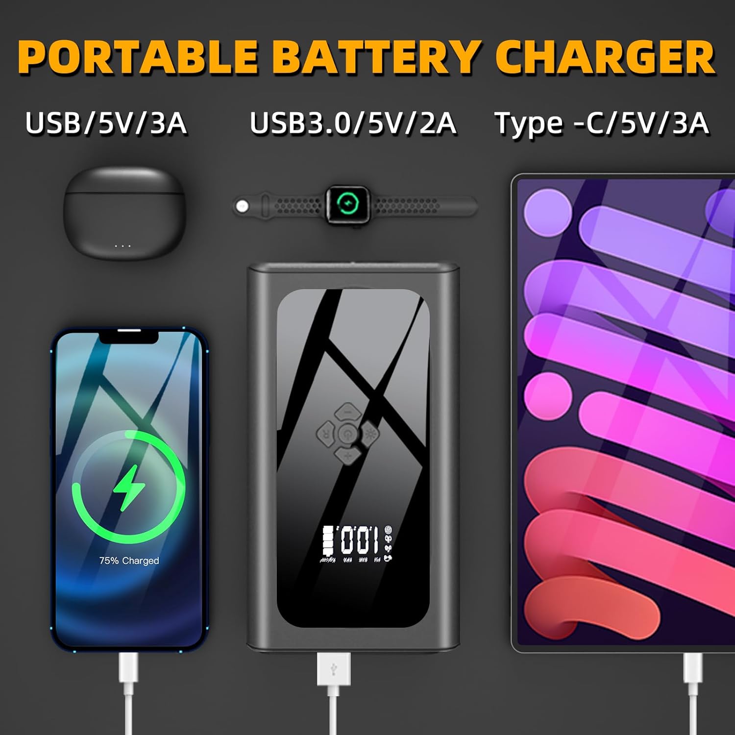 Digital Car Jump Starter with Air Compressor – The Scatach Q12 jump starter battery pack has a built-in large lcd digital display. Compared with other simple jump starter, we added the smart inflation function for Q12, when your car, bike, ball or other inflatable equipment needs to be inflated, preset the required value (psi, bar, kpa), when it finishes this value, it will be turned off automatically. Q12 air compressor will inflate a normal car tire up to 40 psi in about 3 minutes.