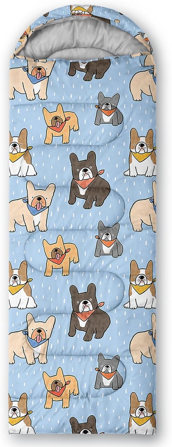 【Fits For 3 Seasons】: Size – 31 by 90 inches (W x D). Our Cartoon Bulldog sleeping bag can be used in 3 seasons with a design temperature of 32℉-77℉(0℃-25℃). These Sleeping bags also have a weather resistant waterproof design to keep you warm and prevent you from any dampness.