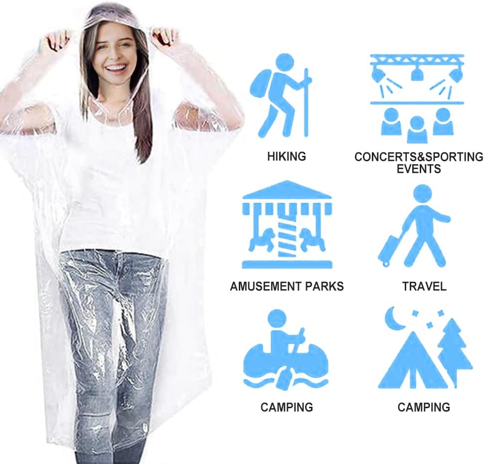 Disposable rain poncho with hood transparent protection will prevent physical wet in the rain. Suitable for travel outdoor activities, festival, amusement parks, mountaineering, hiking, camping