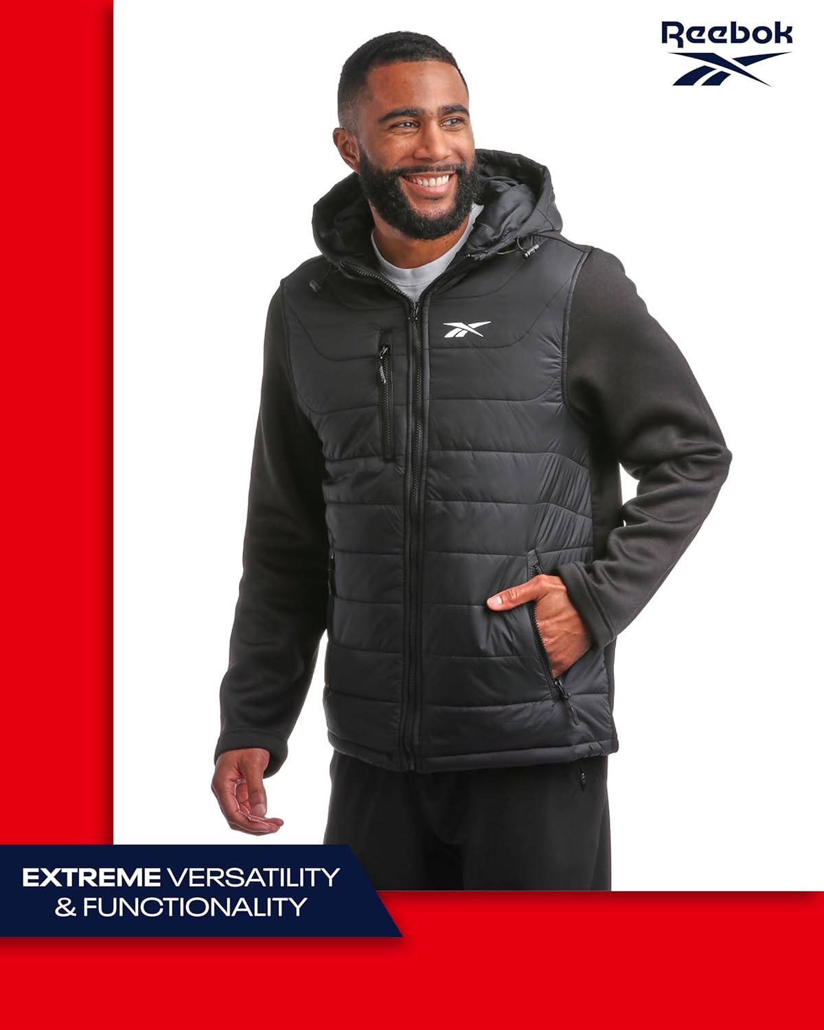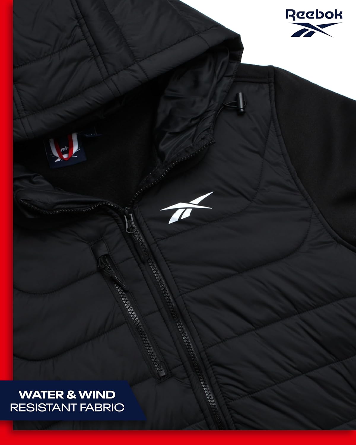 Reebok Men’s Jacket – Quilted Puffer Bomber Jacket with Fleece and Tricot Sleeves – Hooded Outdoor Jackets for Men (L-XL)