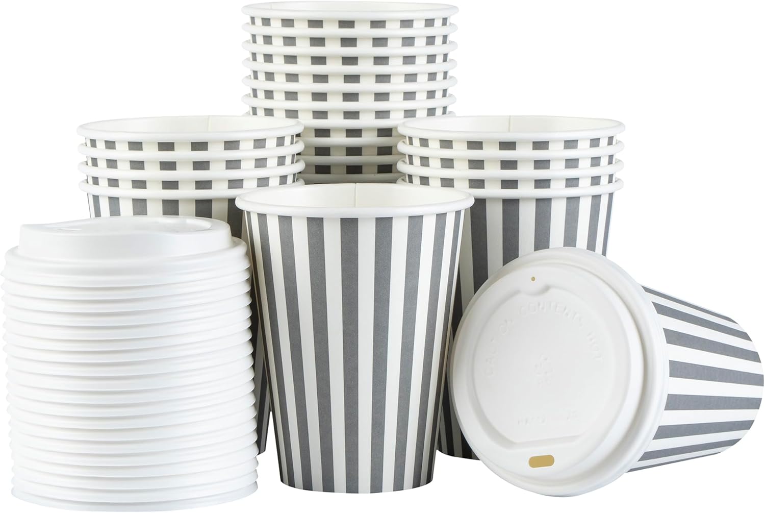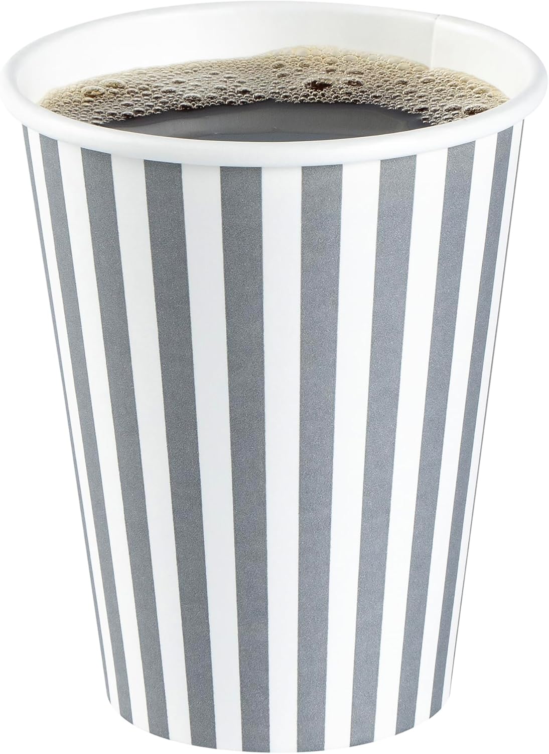 STYLISH STRIPE FINISH: Add a pop of color to your morning! These gray and white striped disposable hot cups add a splash of style to your coffee routine. Brighten up your day!