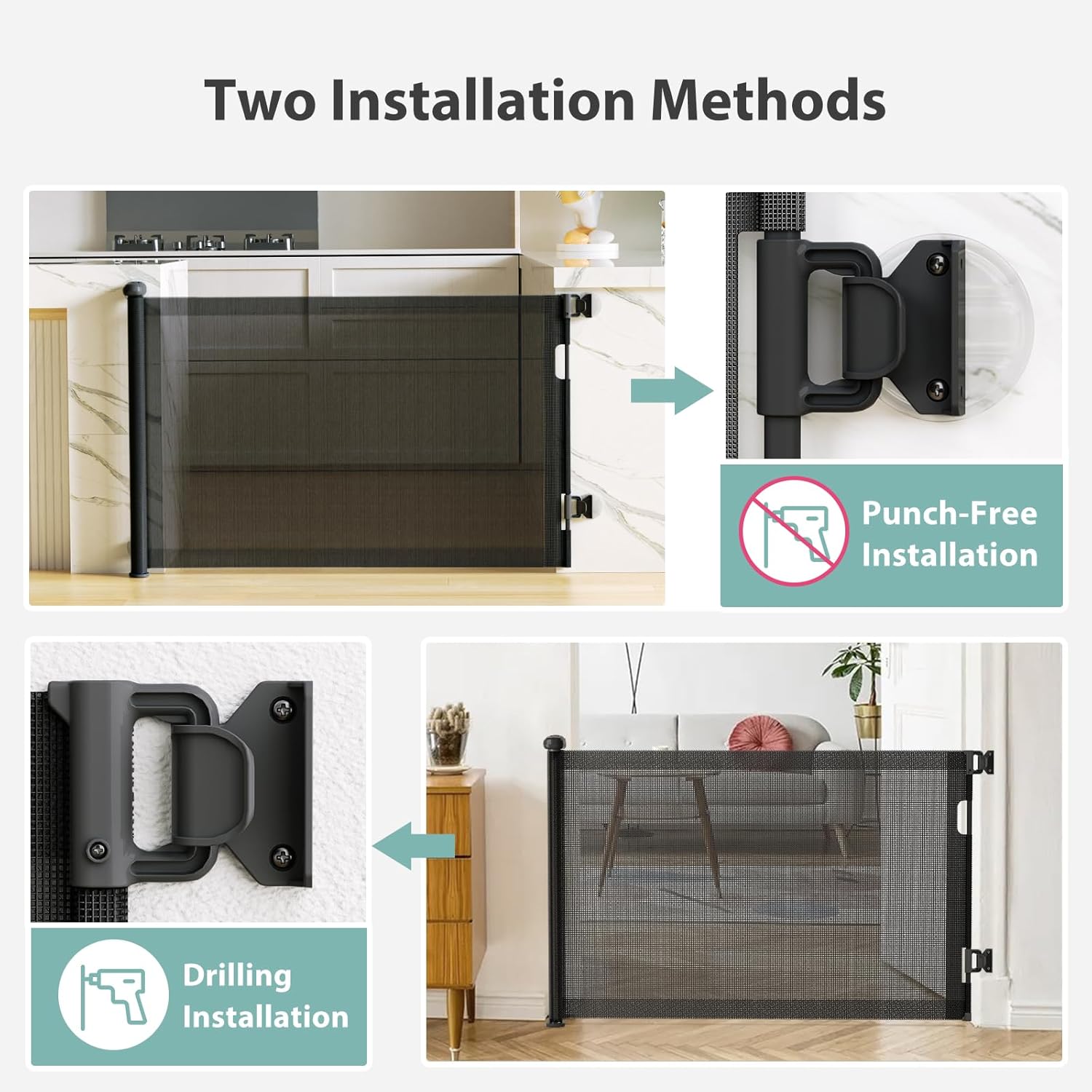 𝟮-𝗶𝗻-𝟭 𝗡𝗼 𝗗𝗿𝗶𝗹𝗹 & 𝗗𝗿𝗶𝗹𝗹 𝗜𝗻𝘀𝘁𝗮𝗹𝗹𝗮𝘁𝗶𝗼𝗻: Our retractable baby gates is thoughtfully designed with two installation options: No drill and drilling installation, ensuring compatibility with almost any wall type. With No Drill installation, we blend simplicity, versatility, and wall protection, delivering a hassle-free solution for various wall coverings.
