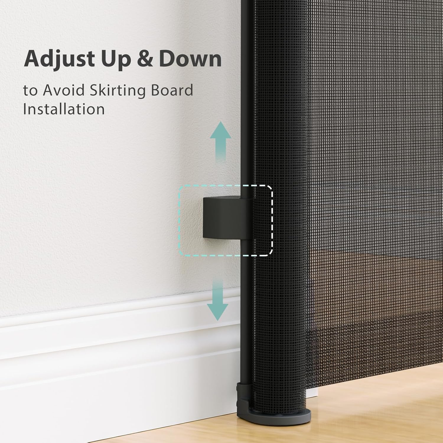 𝗔𝘃𝗼𝗶𝗱 𝗦𝗸𝗶𝗿𝘁𝗶𝗻𝗴 𝗕𝗼𝗮𝗿𝗱 𝗜𝗻𝘀𝘁𝗮𝗹𝗹𝗮𝘁𝗶𝗼𝗻: Our retractable mesh baby gate features adjustable brackets to accommodate various wall and gate frame heights, ensuring a seamless fit. This baby gate enhances convenience, aesthetics, and adaptability, providing a smooth and efficient experience.