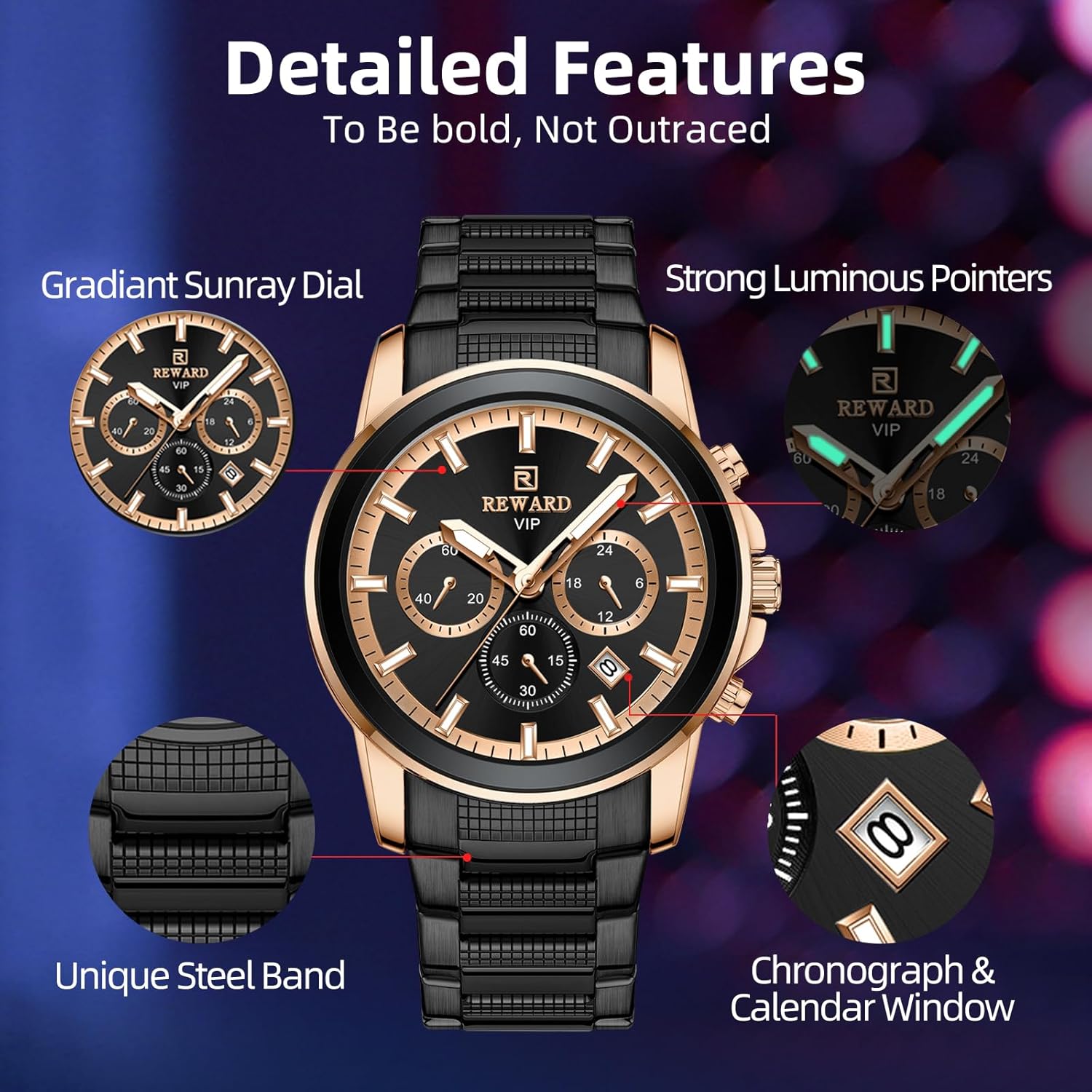 The super cool, REWARD mens pro Business collection chronograph water wave dial new design, vacuum IP plating case stainless steel band watch is a high-performance business sports watch for the modern man.
