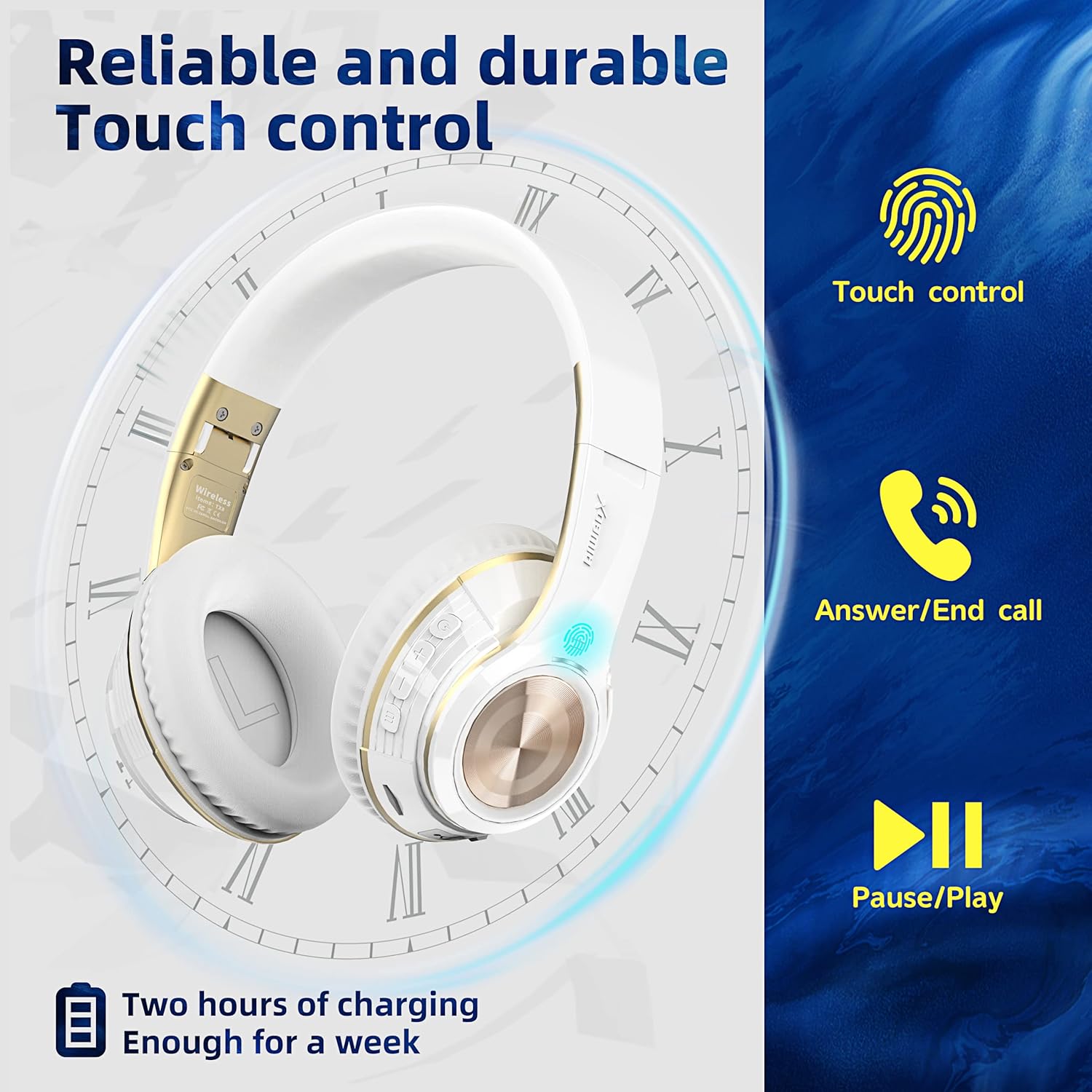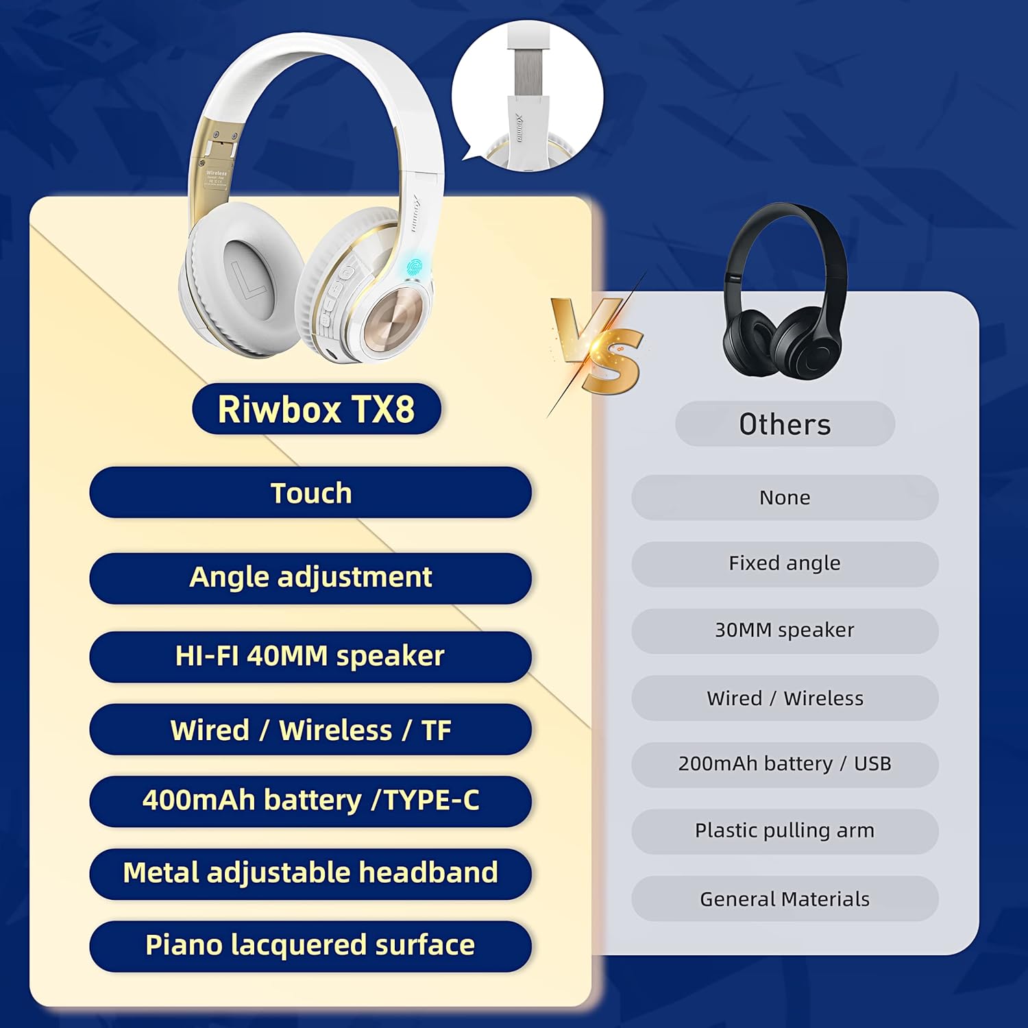 Riwbox TX8 Bluetooth Headphones, Over Ear Headphones, HiFi Stereo, with Touch Control and mic, Soft Earmuffs/Foldable/SD/TF, 40H Playtime, for Travel/TV/Music/OFC/Gym/Game