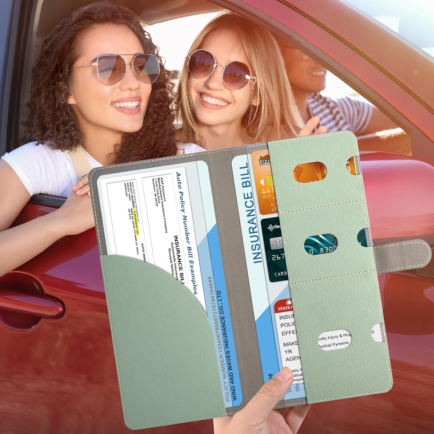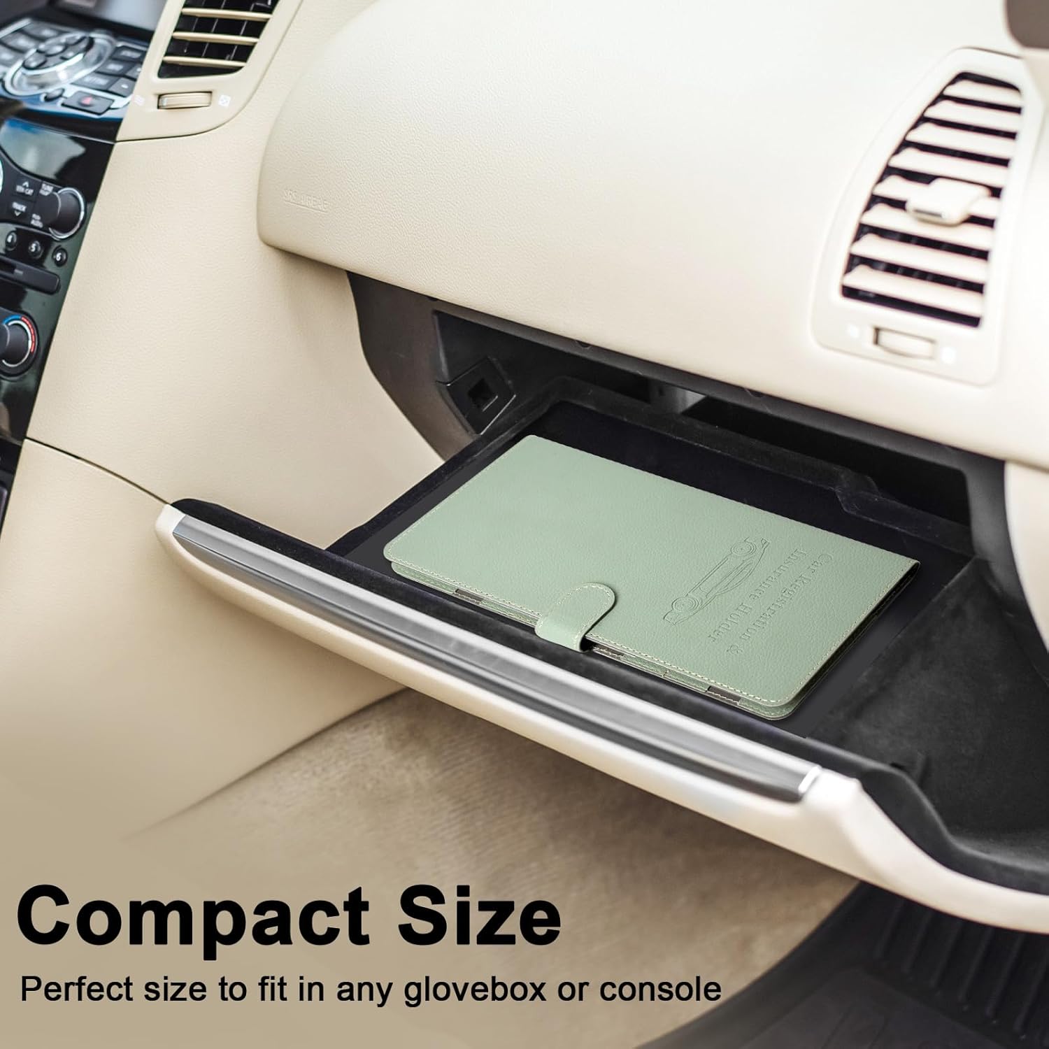 COMPACT SIZE: The insurance and registration holder is a moderate size. The closure size, 5.5in x 9.6in x 0.35in, the expansion size: 11inch x 9.6inch. whether men or women will not feel too big or too bulky when holding it. And it can be fit for any glovebox or console well.