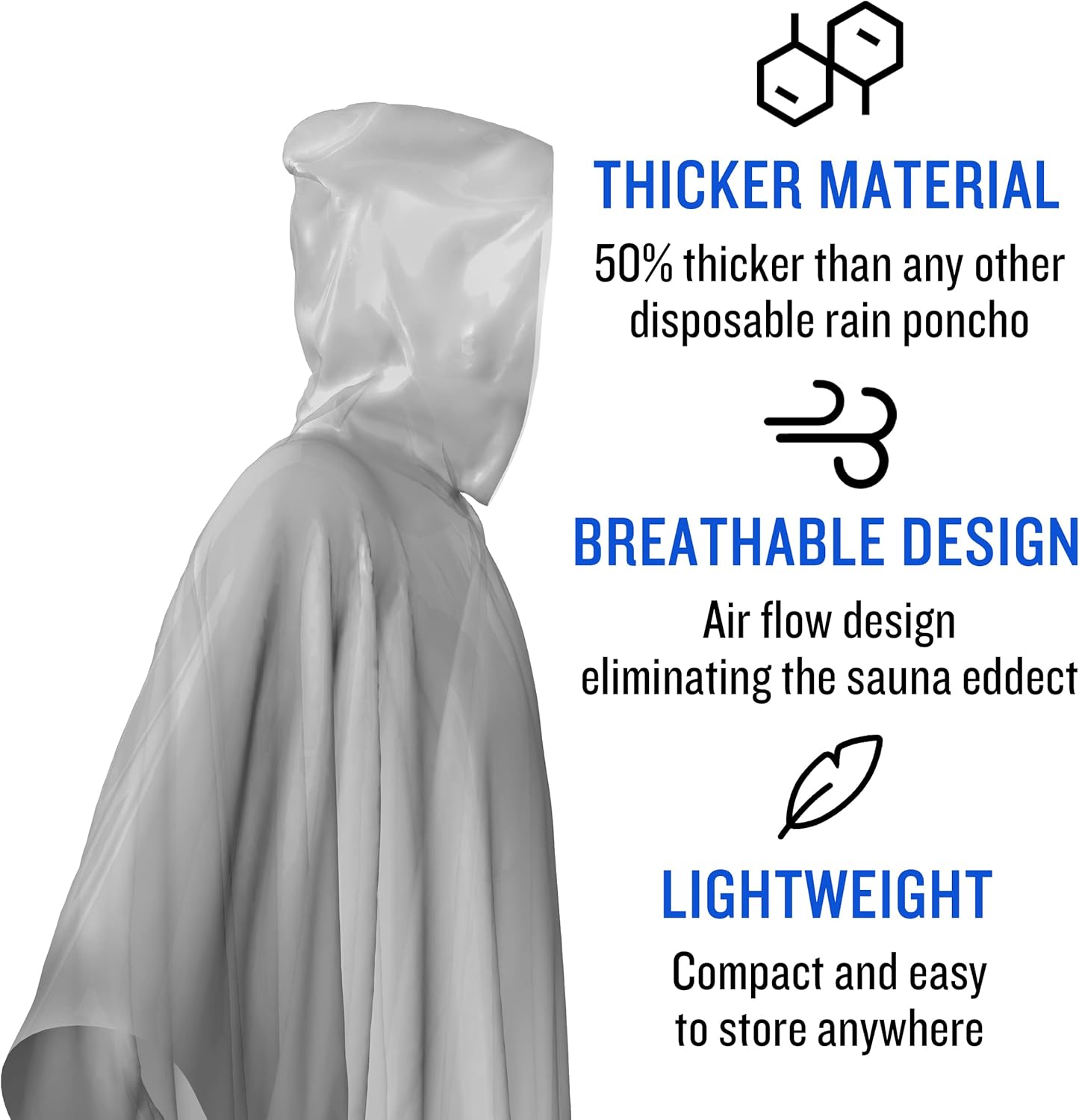 【Material and Design】Made from 0.035 mm thick PE plastic, these clear, waterproof ponchos are extra thick and durable. Each poncho includes a hooded design for full-body coverage and comes individually packaged in a 4-pack.