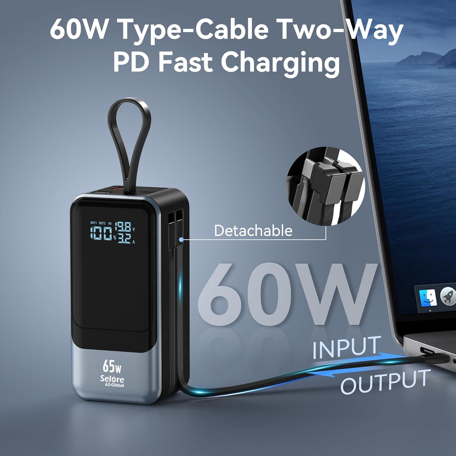 Selore Power Bank, 65W Laptop Portable Charger with Built in USB C Cable, 4 Outputs, Fast Charging External Battery Pack for Laptop MacBook Dell XPS iPad Tablet iPhone 16/15 Series Samsung S24 et