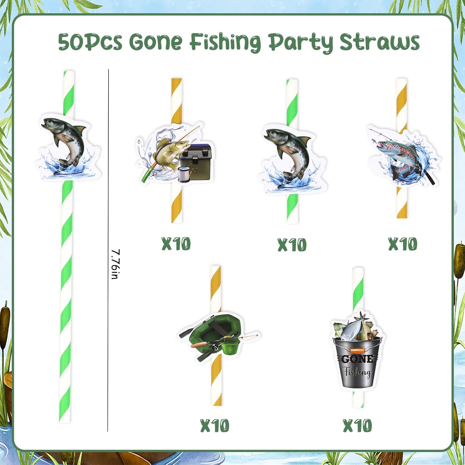 Gone Fishing Party Favors Straws: The fishing party decorations comes with 50 pieces fish element party paper straws featured 5 different toppers, 10 pieces of each pattern. By the way, they also can be nice photo booth props, to leave impressive pictures for you