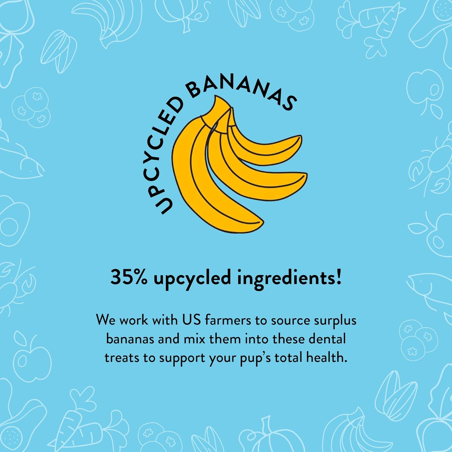 Upcycled With Care: We work with farmers to rescue their imperfect fruits and vegetables that have all the same healthy nutrients. This means every bag of our treats decreases food waste while saving valuable resources.