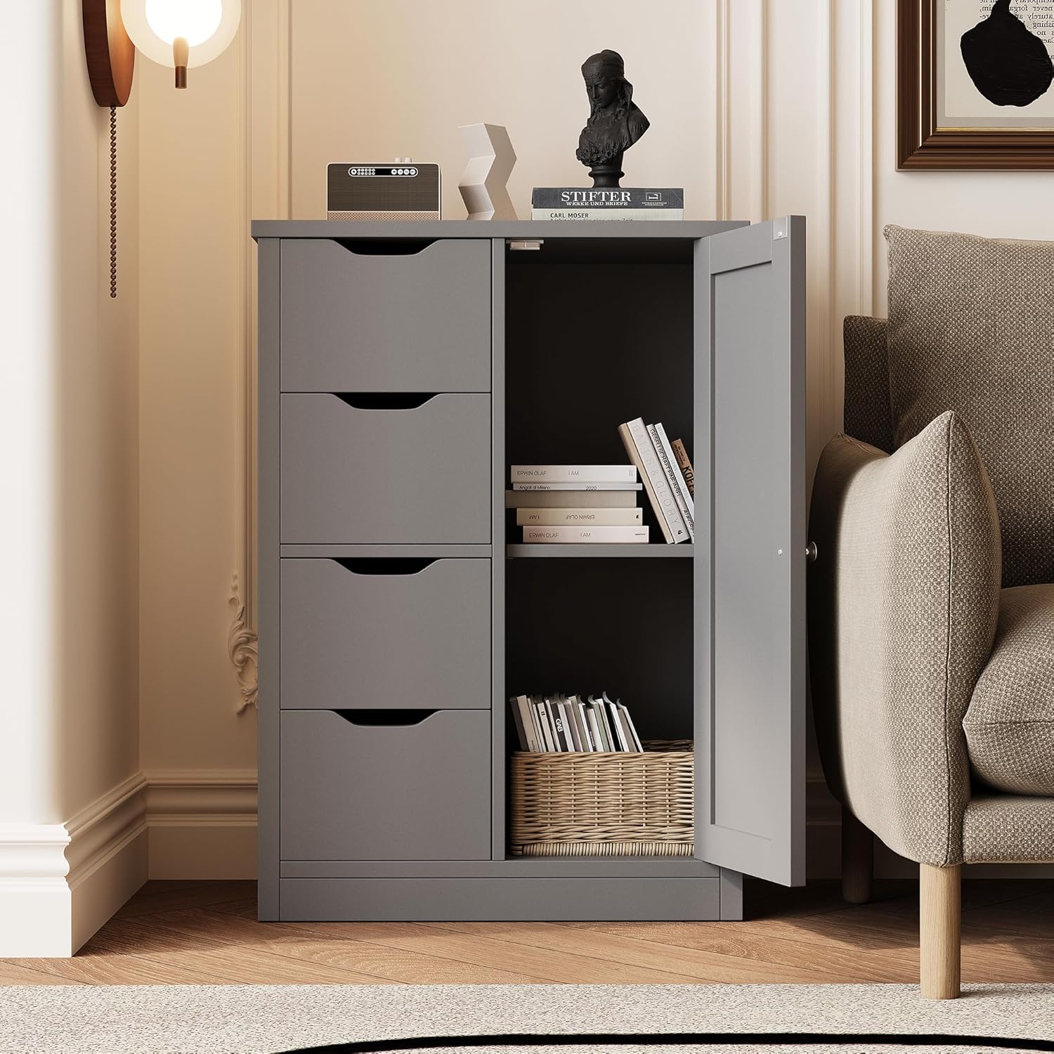 Shintenchi Bathroom Floor Storage Cabinet, Wooden Storage Organizer with 4 Drawers and 1 Cupboard, Freestanding Bathroom Furniture, Home Storage Unit with Adjustable Shelf, Gray