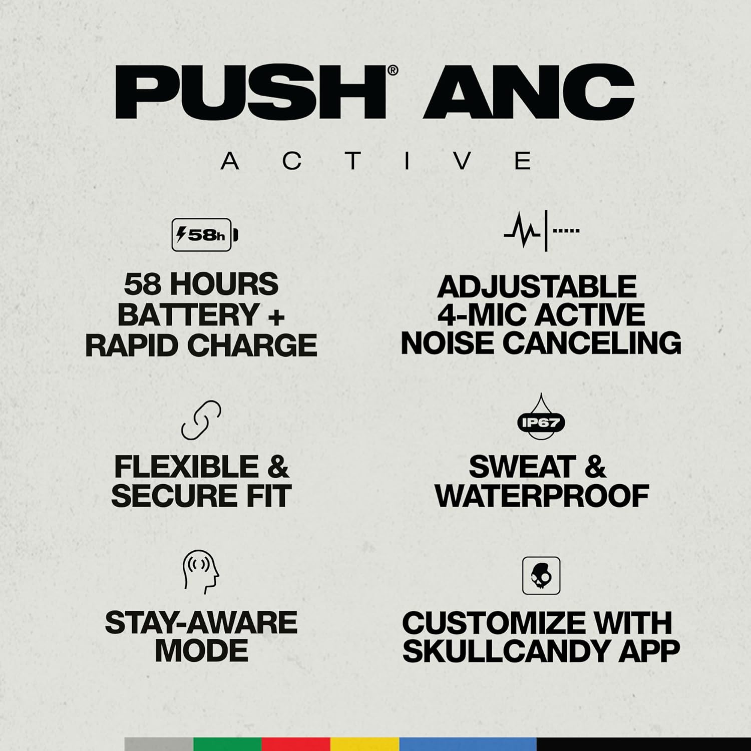Skullcandy Push ANC Active in-Ear Wireless Earbuds, 58 Hr Battery, IP67 Waterproof, Wireless Charging, Microphone, Works with iPhone Android and Bluetooth Devices – True Black/Orange