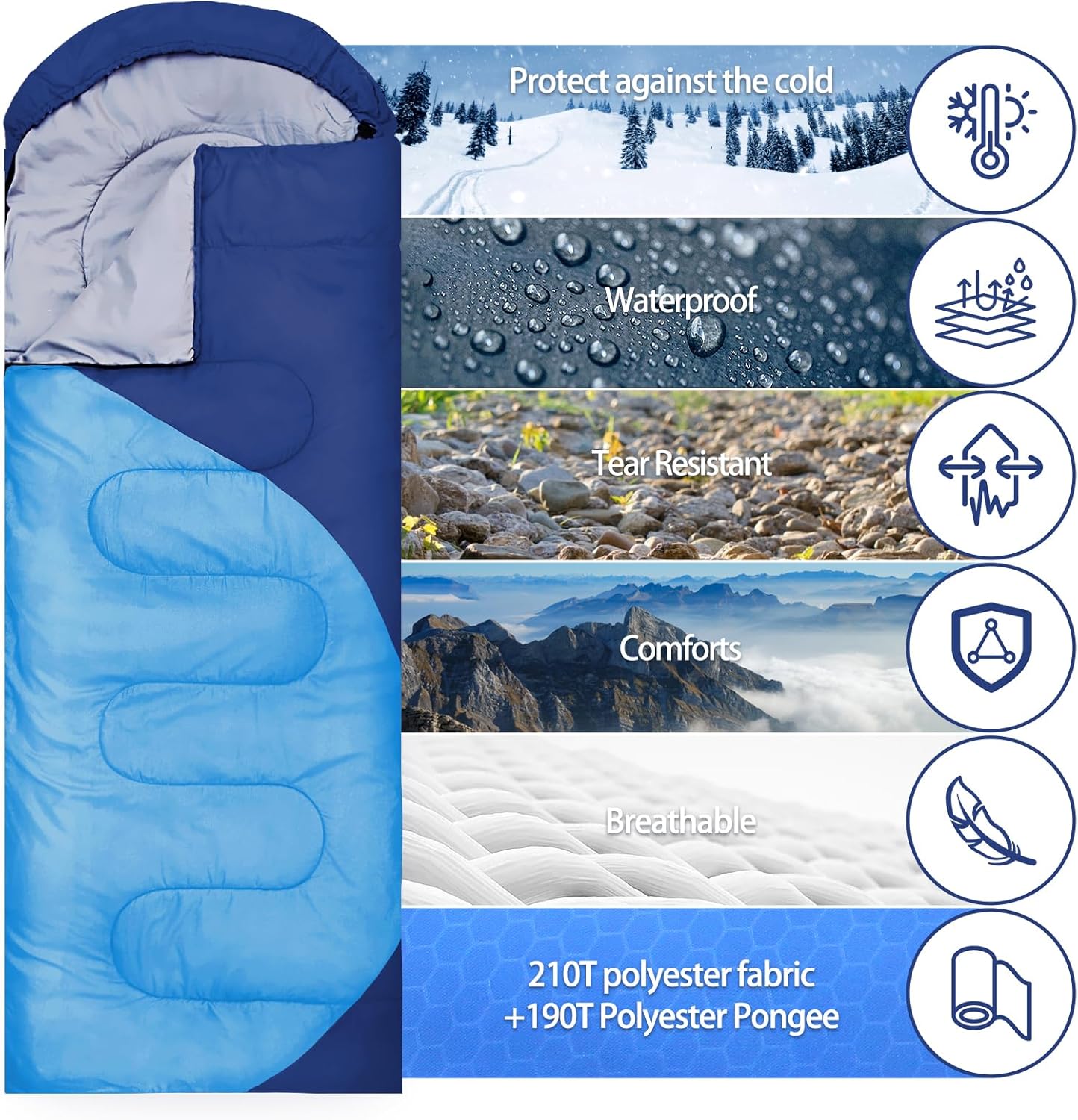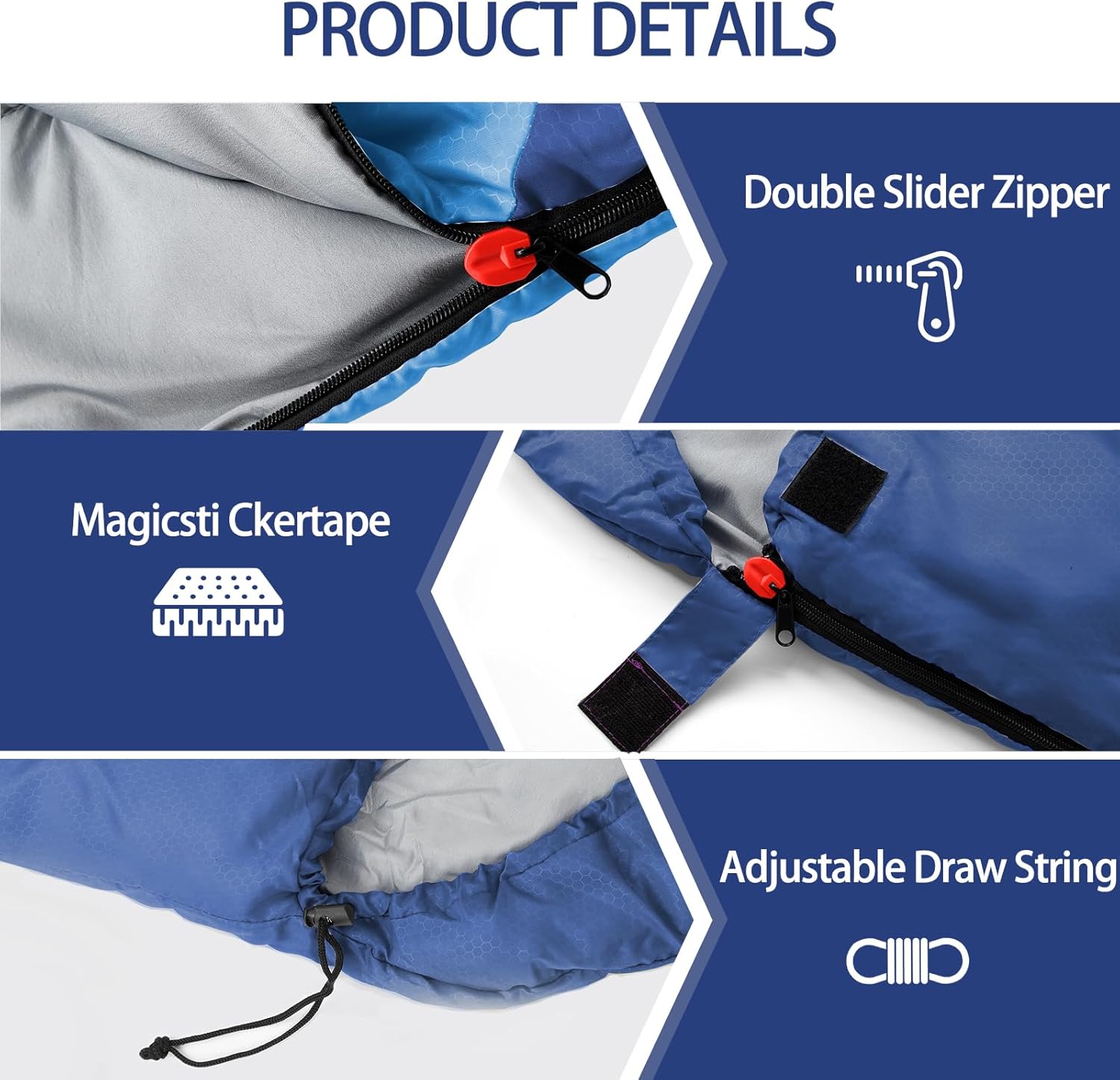 PREMIUM MATERIAL – Camping sleeping bag is made of premium 210T ripstop microfiber fabric, comfortable and breathable, lined with 190T polyester pongee. The waterproof outer protective shell is made of unique hexagonal design and high quality Material with double S-stitching and polyester filling for optimal warmth and insulation to protect you from the elements. The bright colors are loved by boys and girls, great for kids and adults alike!