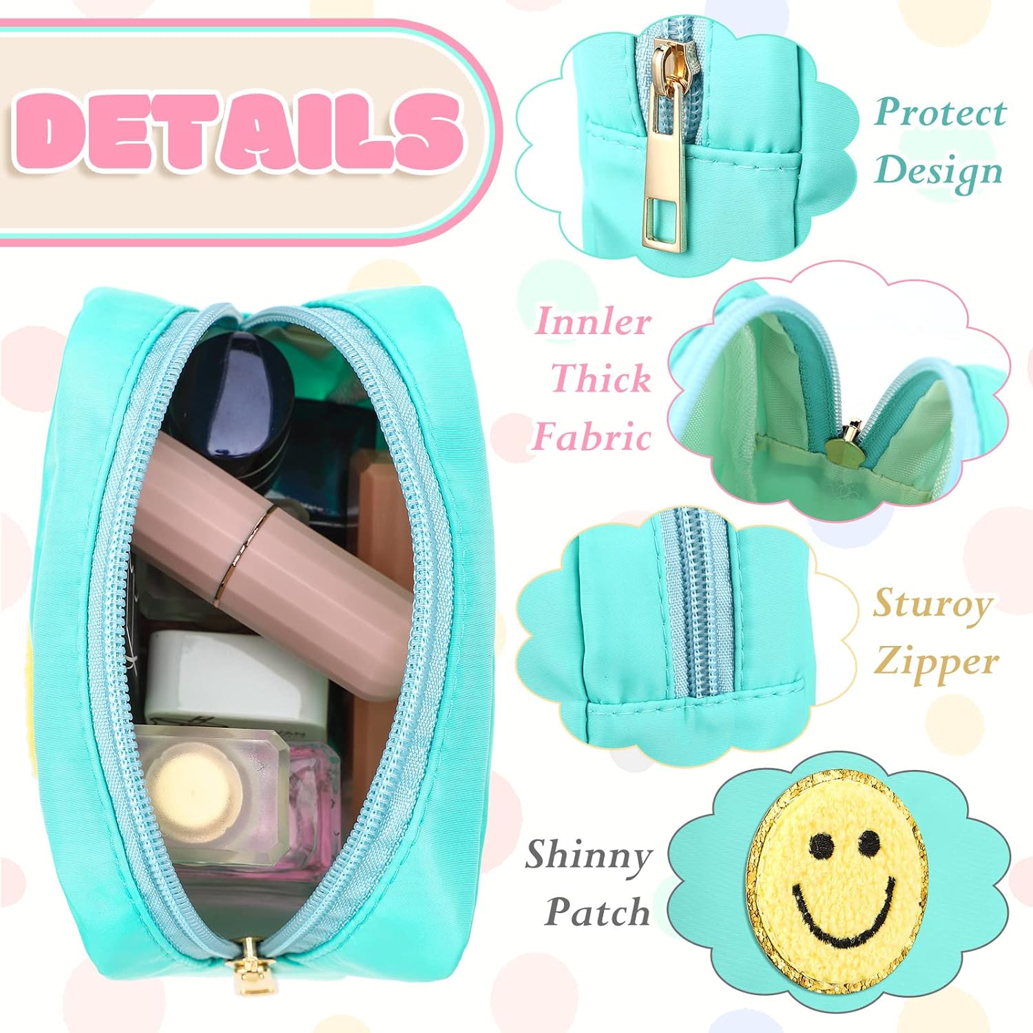 Lovely Preppy Design: this travel cosmetic pouch comes with many preppy themed patterns, such as smile face, butterfly, and rainbow, vivid and beautiful, and can match with your different daily outfits; What’s more, the makeup pouch comes with a smooth zipper, which is easy to open or close