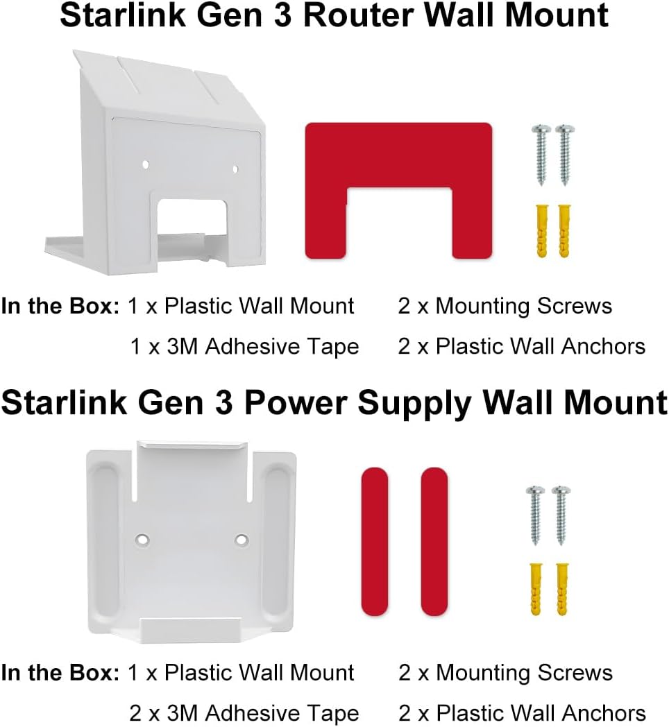 Perfect Compatibility: This is a set of plastic mounts for the gen 3 Starlink power supply and router. Allows you to mount the power supply and router to the wall, keeping your Starlink off the floor. Note this is for the horizontal router not the older vertical upright router