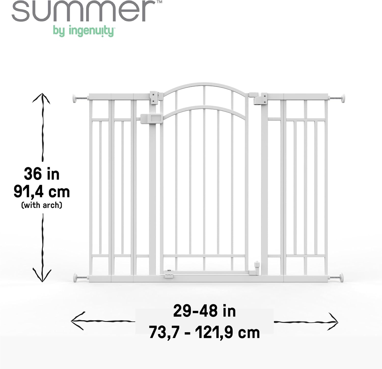 Keep your loved ones safe & secure in style with The Summer by Ingenuity Doorway 48W Series Pet and Baby Gate. Measuring 36″ tall (including a decorative arch), this white metal safety gate conveniently helps contain children and pets while complementing your home dcor. Our Hold-Open and Auto-Close technologies add convenience as you navigate your home. When opened more than 90 degrees, the door will stay open. When engaged less than 90 degrees, the door will close. A variety of included extensions help you configure the ideal setup for spaces from 29 to 48 inches wide. Install it in doorways or hallways quickly & easily using the included no-drill pressure mount system with adhesive wall cups that help protect your walls from damage. Or use it at the top of the stairs with included hardware (required for safe stairway installation). Recommended tools for hardware installation (not included): drill, Phillips-head screwdriver, pencil, measuring tape. NOTE: Gate will appear as though the door is off-center when taken out of the package until you mount it into the doorframe and tighten the bolts according to instructions.