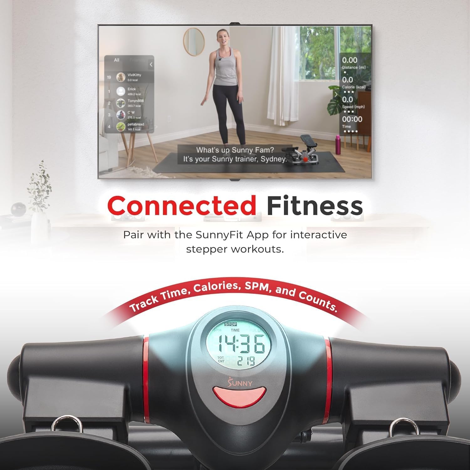 【CONNECTED FITNESS】Stay updated with the digital monitor showcasing Time, Calories, SPM, and Counts. Pair with the SunnyFit App via Bluetooth to track progress, set goals, and dive into 1000+ virtual workouts and 10,000+ global routes.