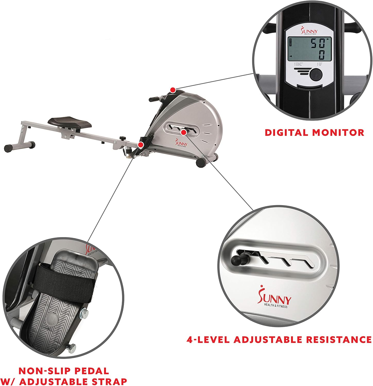 Sunny Health & Fitness Rowing Machine Rower Ergometer with Digital Monitor, Inclined Slide Rail, 220 LB Max Weight and Foldable – SF-RW5606