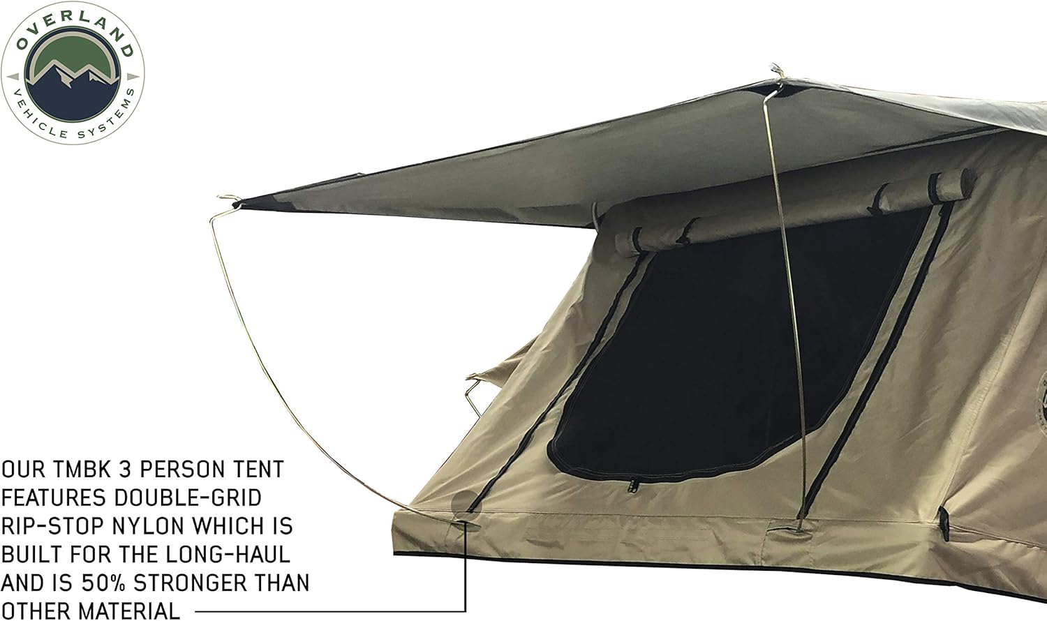Overland Vehicle Systems TMBK 3 Roof top tent’s are made from the finest materials. Starting out with heavy aluminum plated base assembled using marine grade stainless steel hinged and hardware! Features a 81” square sliding ladder with steel hinges! Our Roof Top Tents are 4 seasons ready! Our Rooftop Tents are constructed using a 600D Heavy Duty Poly Cotton Rip Stop Canvas bodies that are build to stand the test of time through the harshest of conditions you can put yourself in. The Rainfly’s are made of a 420D Heavy Duty Polyester Oxford Waterproof Material to protect you and your family from the rain and snow!