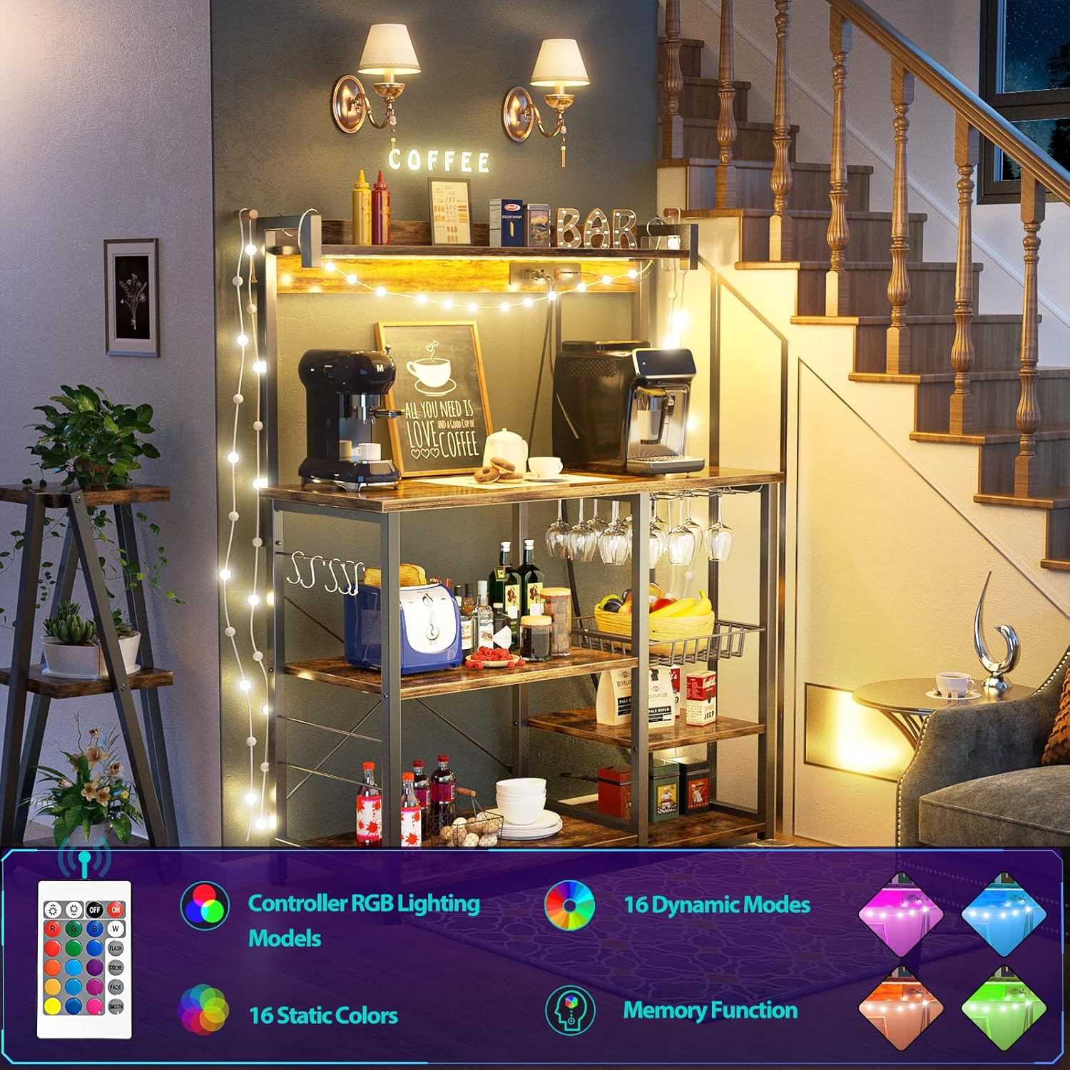 Topfurny Bakers Rack with Power Outlet, Microwave Stand, Kitchen Storage Shelf with Led Lights, Coffee Bar Station with Wine Glass Holder, Kitchen Rack for Spices, Pots, and Pans, Rustic Brown