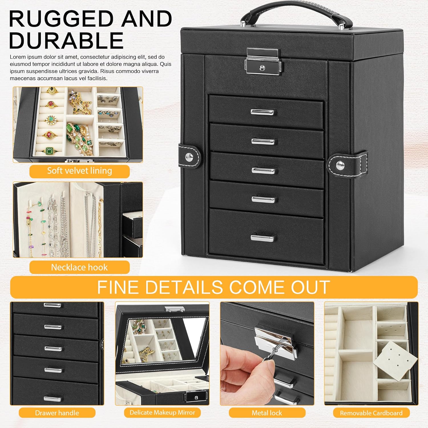 6 Layers, Large Capacity: 8.3″x 6″ x 10″. This jewelry box has different storage space, 5 drawers, you can put all your jewelry in neatly. Such as rings, bracelets, earrings, brooches and other jewelry