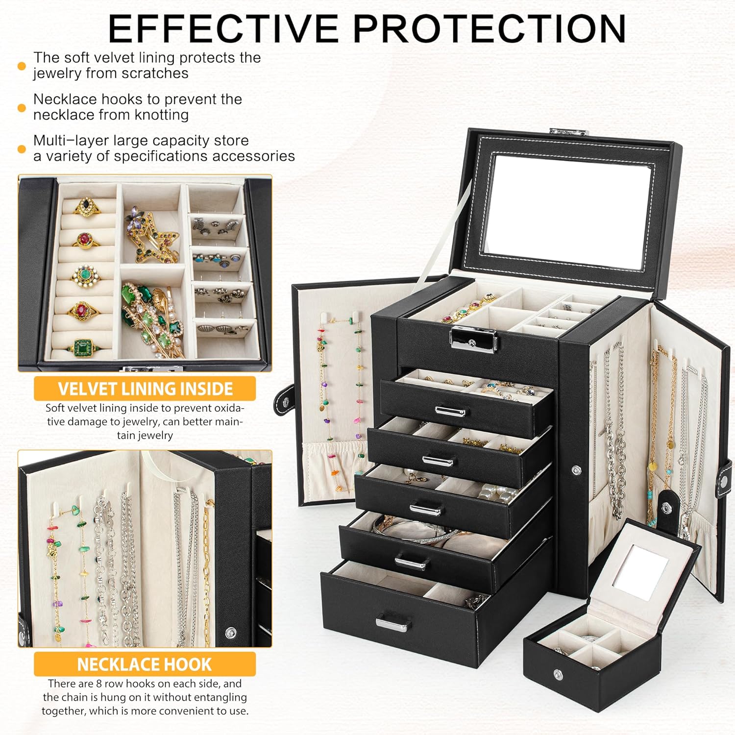 With Inner Mirror and Lock: There is a mirror on the top layer of the jewelry box organizer, which allows you to do makeup and check makeup at the same time, especially when you go out to work or on an appointment in the morning, saving your precious time