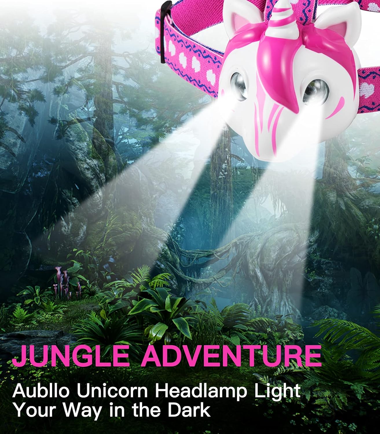 [UNICORNS HEADLAMP FOR KIDS] Aubllo LED headlamp not only does it have an excellent quality of light output from it’s dual eyes for nighttime usage, it produces a lifelike unicorn call, has colorful light color mode.His cute shape and unicorn mythical color will make children love it
