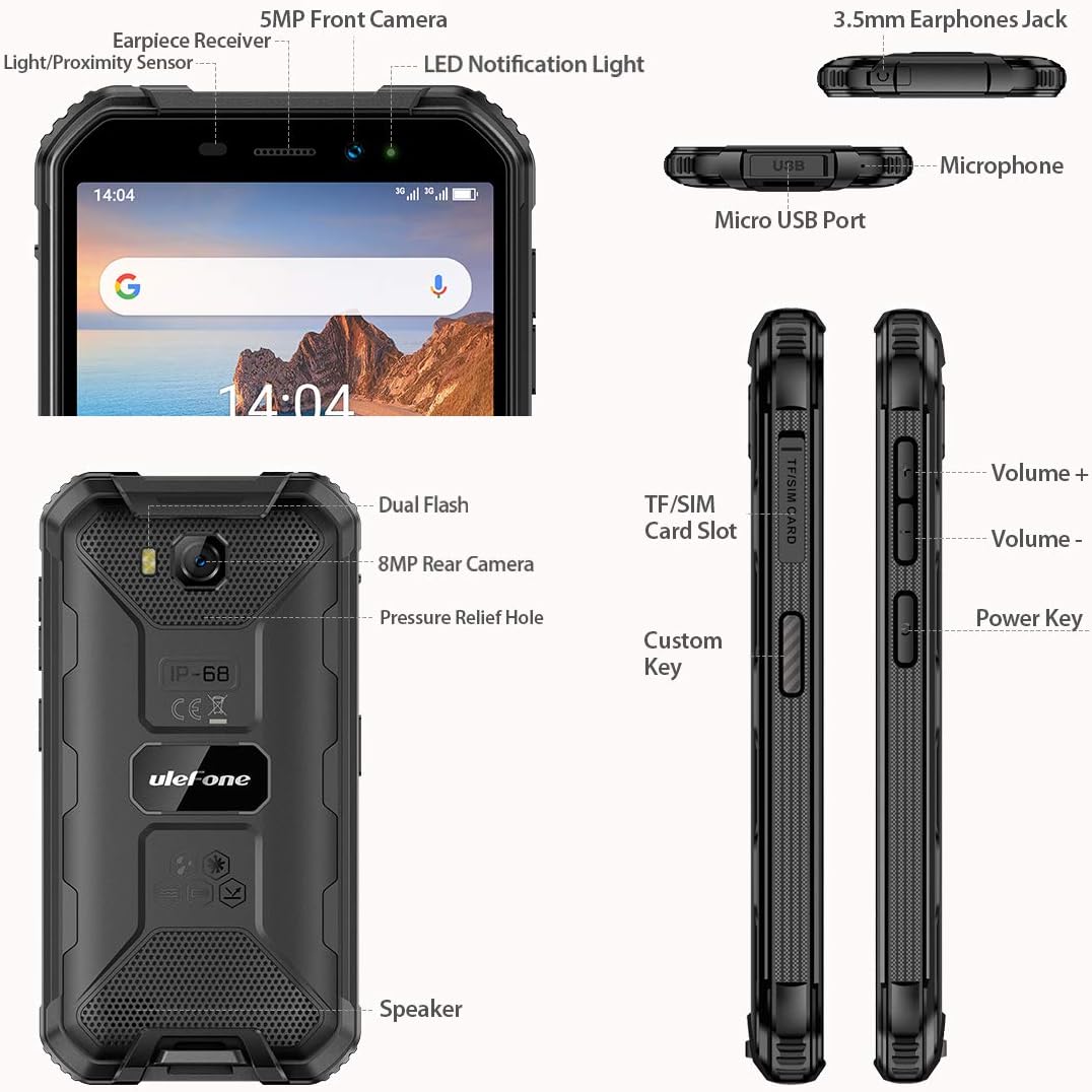 【360°Full Protection + 5.0 inch HD+ Display】5.0-inch screen provides good hand grip feeling and convenient single hand operation. The Armor X6 is IP69K certified and protected against close-range high pressure and high temperature water jets. Every hole got a protection layer that blocked the water, dirt and sand out. It can be used for people who working in special industries like relief workers, building workers, coal miners, etc.