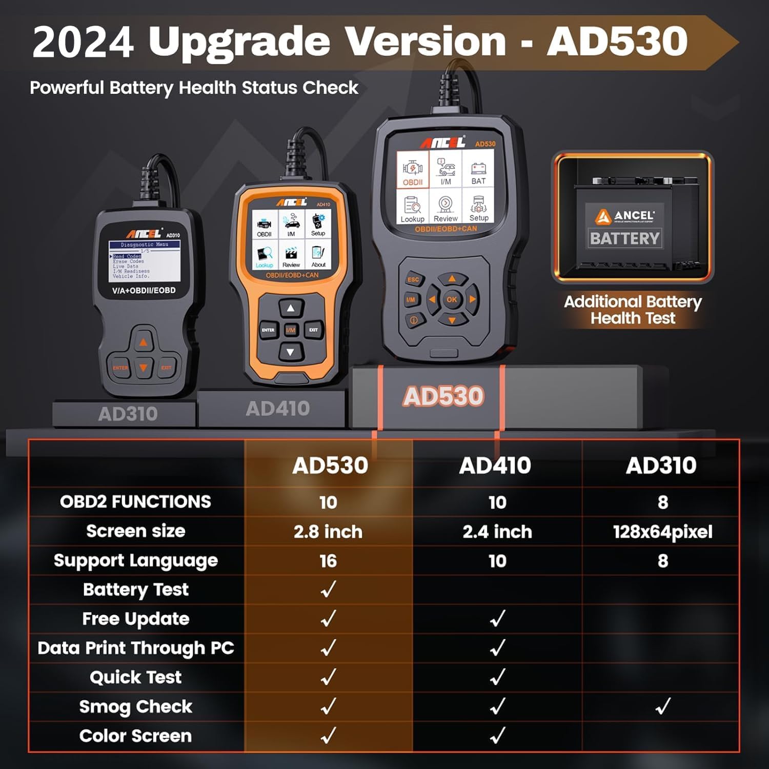 🥇【2024 Upgrade 2-in-1 Car Diagnostic Scanner】ANCEL AD530 car scanner diagnostic tool is upgraded from AD310 in the actual fault detection of 300,000 cars. It can not only check the engine failure, and provide maintenance suggestions, but also a professional battery tester, which can check the health of the car battery. It is a real two-in-one car coder reader that has been tested by the market. Owning AD530 is equivalent to owning AD310 and a professional battery tester at the same time.