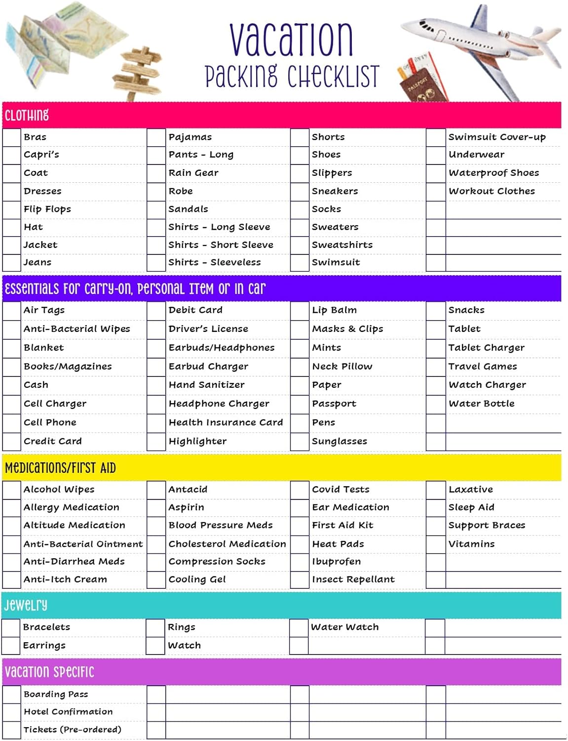 Side #1 – Toiletries, Makeup, Essentials Items Side #2 – Clothing, Essentials for Carry-on, Personal or Car, Medications/First Aid, Jewelry, Documentation